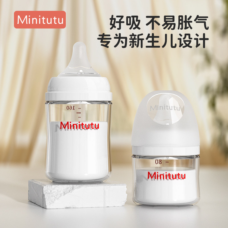 Minitutu宽口径玻璃奶瓶婴儿新生奶嘴仿母乳0到2岁以上防胀气瓶身