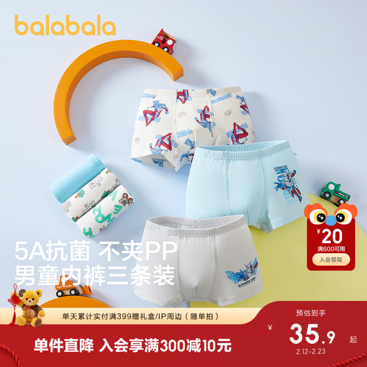 【balaOne】巴拉巴拉儿童内裤棉男童不夹pp抗菌裆四角短裤三条装