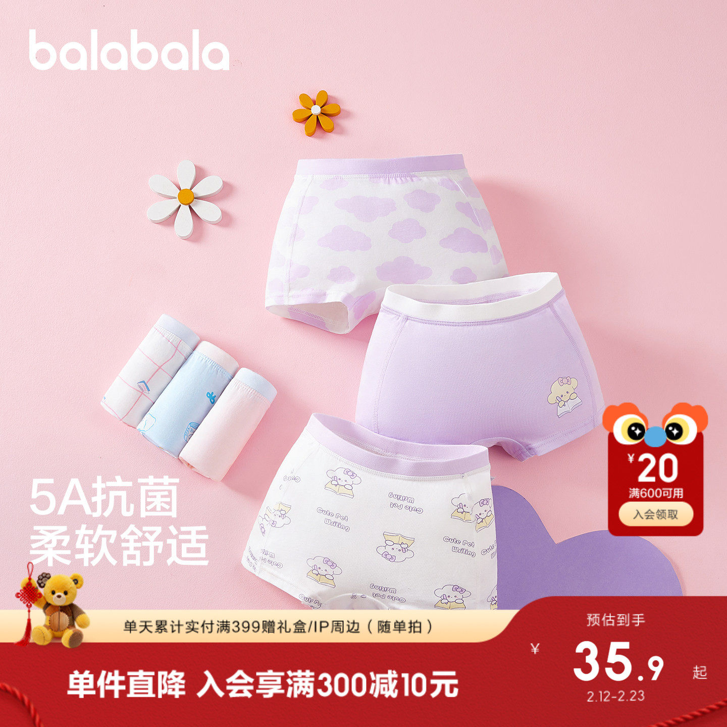 迷你巴拉巴拉儿童内裤男女宝宝抑菌不夹pp四角短裤5条装棉平角裤