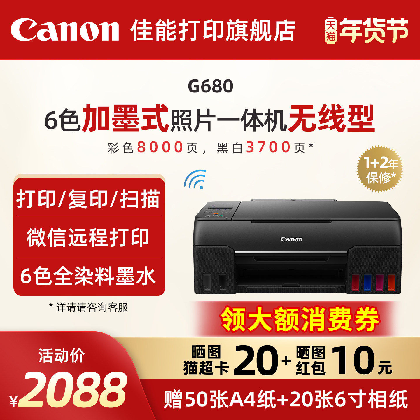 佳能旗舰店G580/G680原装加墨彩色A4喷墨打印复印扫描打印机一体机学生家用微信远程打印影楼6色照片可连手机