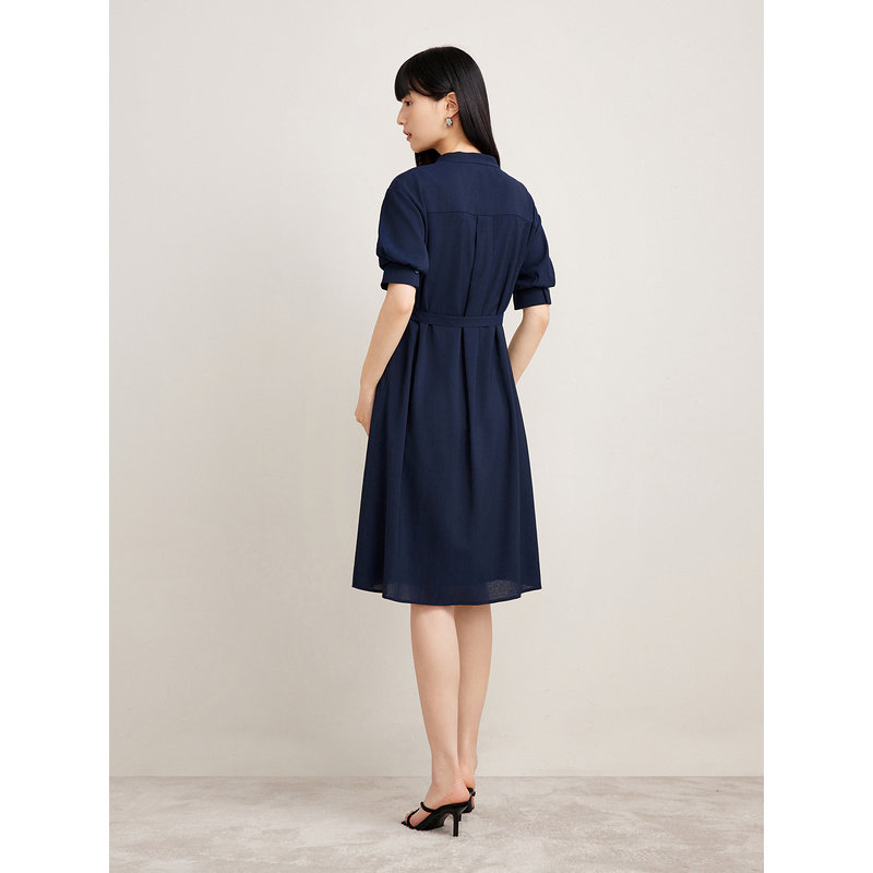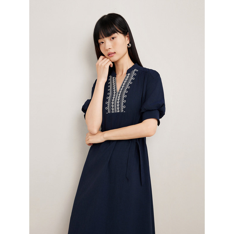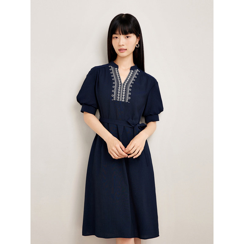 Goodland美地女装秋季法式绣花半开领泡泡袖系带收腰连衣裙