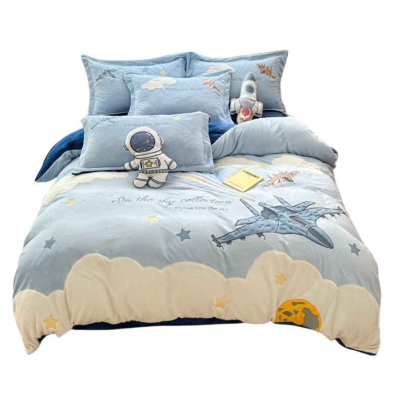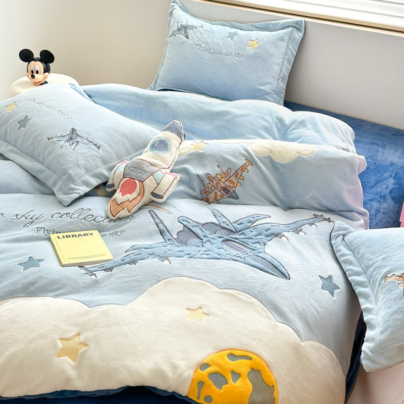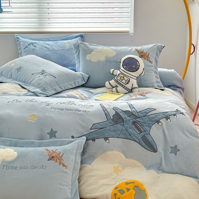 卡通风加厚牛奶绒四件套可爱小飞机刺绣被套秋冬保暖男孩床上用品
