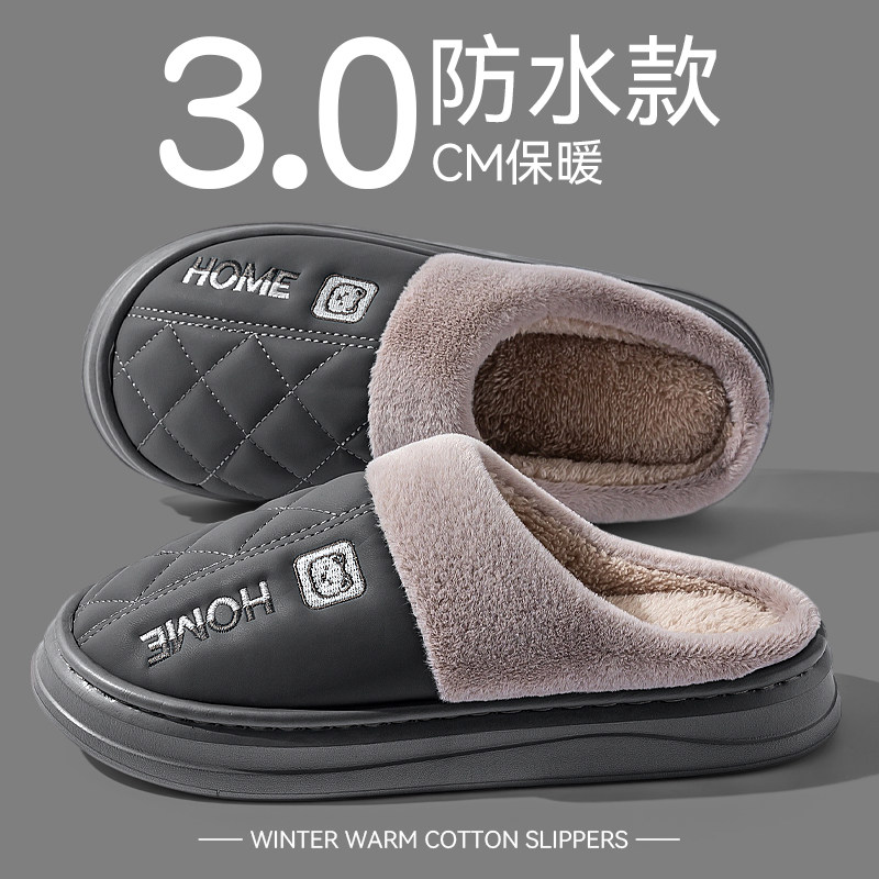 老人棉拖鞋女包跟冬季防水防滑厚底情侣加绒保暖带跟皮面男士棉鞋