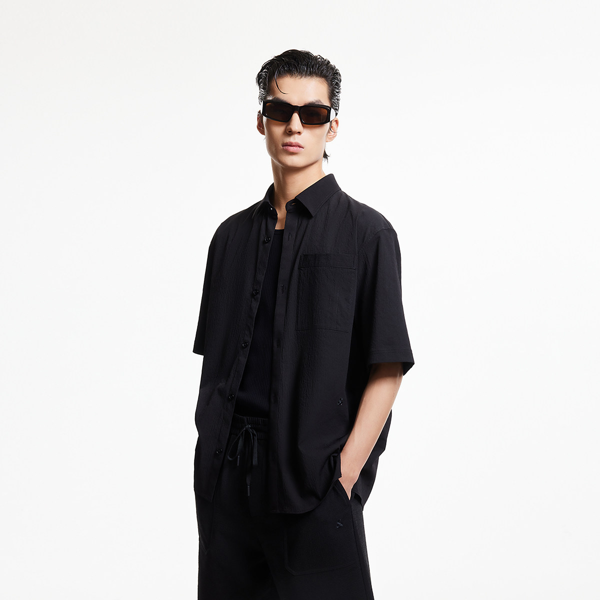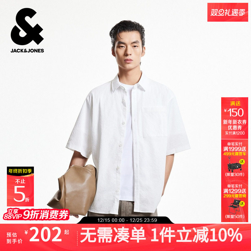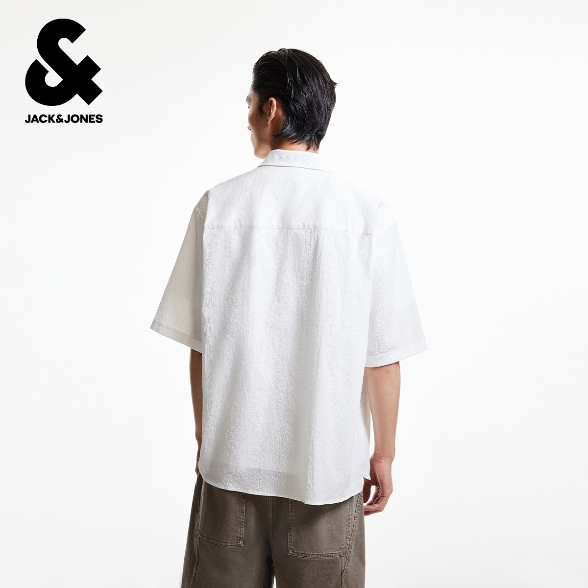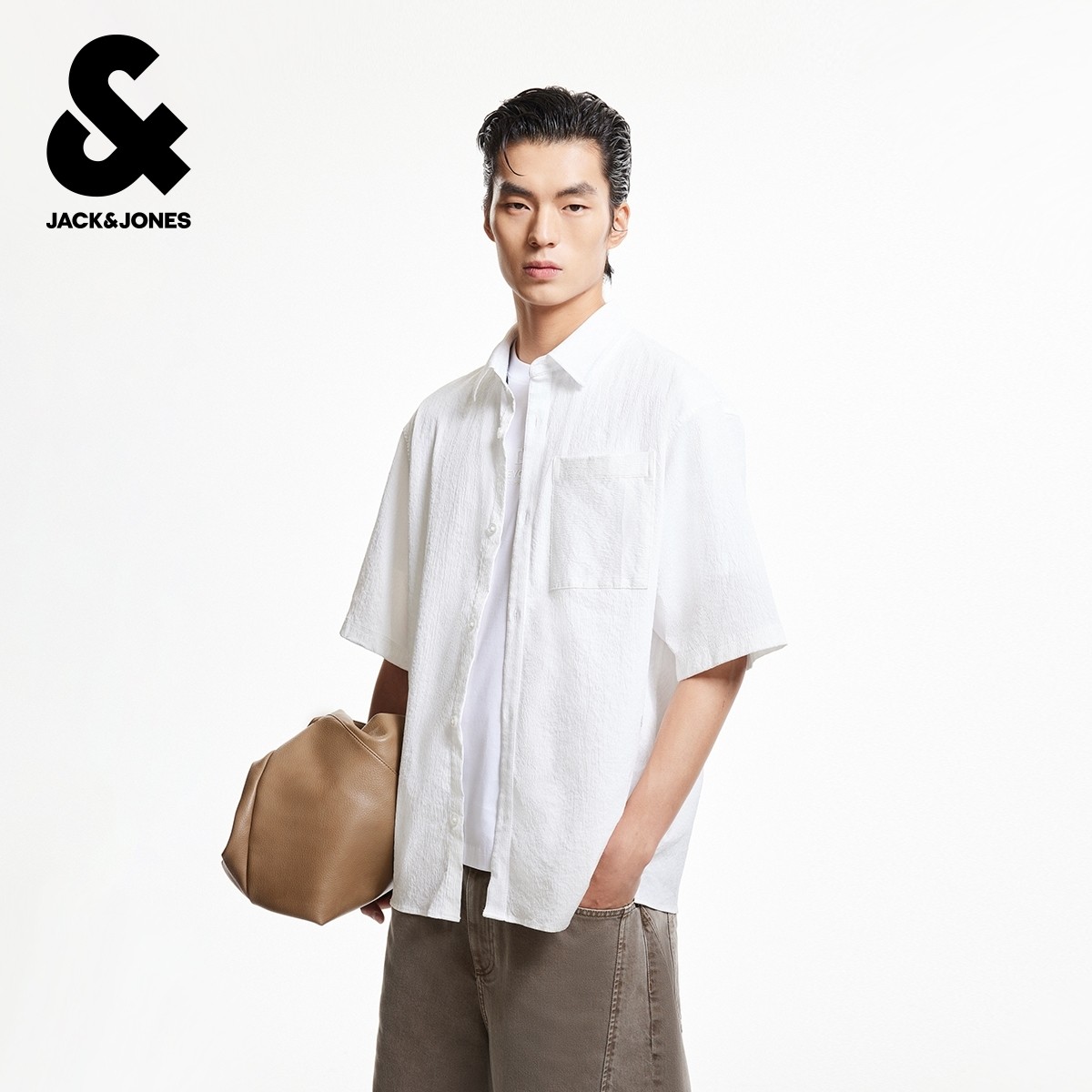杰克琼斯秋季新款时尚百搭潮纽扣刺绣翻领宽松休闲短衬衫男装