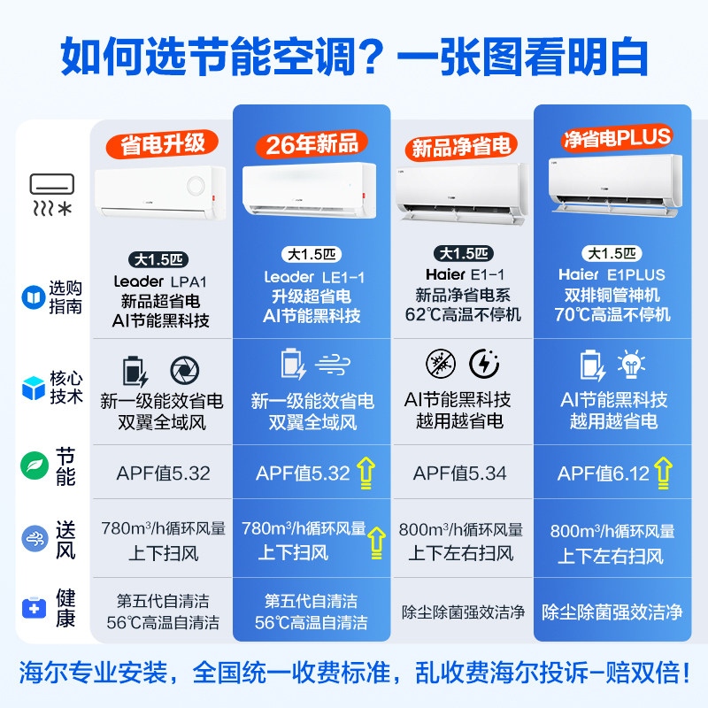 【纯铜管】海尔空调1.5匹1匹家用一级变频冷暖挂机净省电E1旗舰店