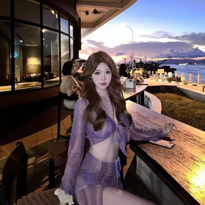 2025新款分体比基尼四件套紫色高级感海边度假泳衣女带胸垫三角