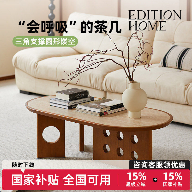 复古风茶几客厅家用岩板网红爆款中古茶几洞石椭圆茶几桌实木茶台