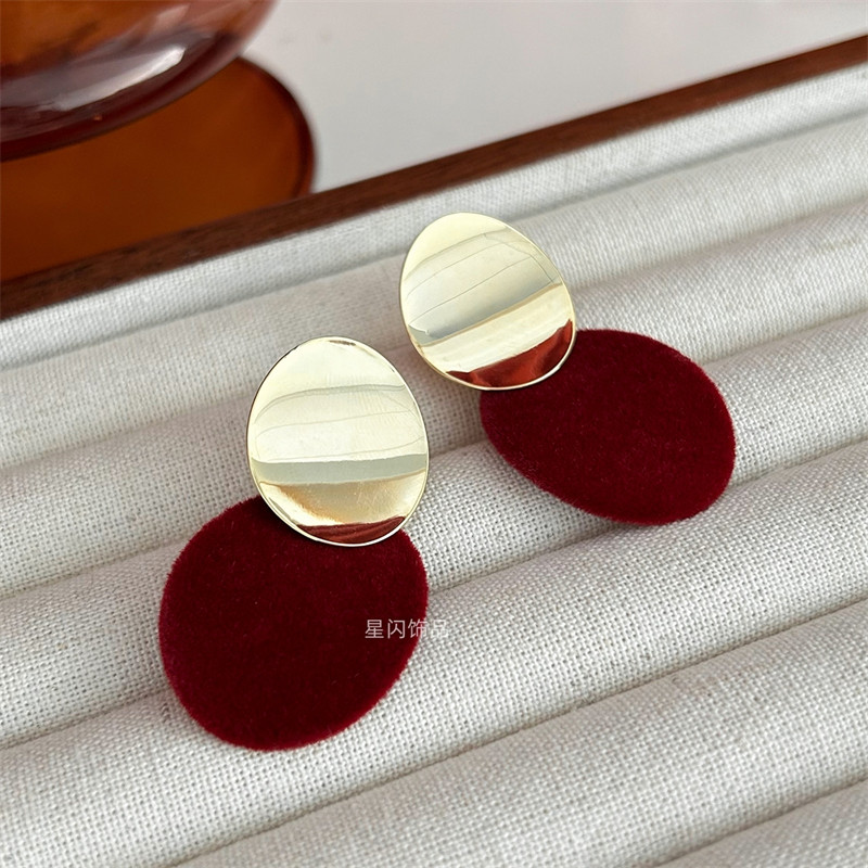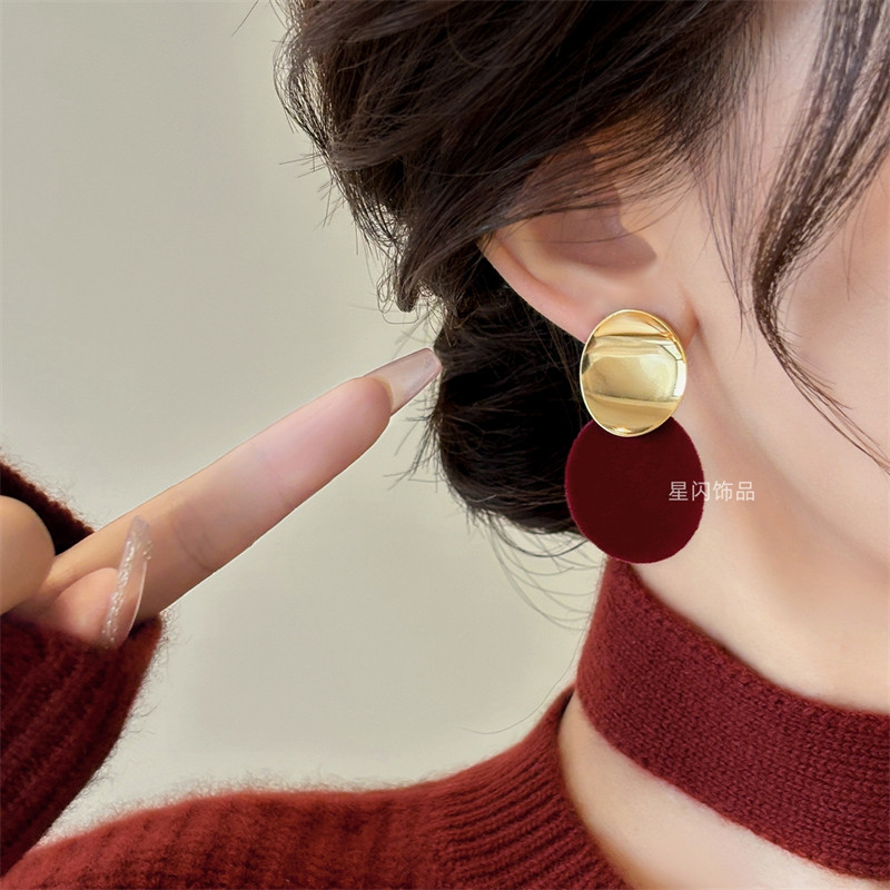 安可拉红不对称圆片耳环纯银小众独特丝绒耳钉2025新爆款高级耳饰