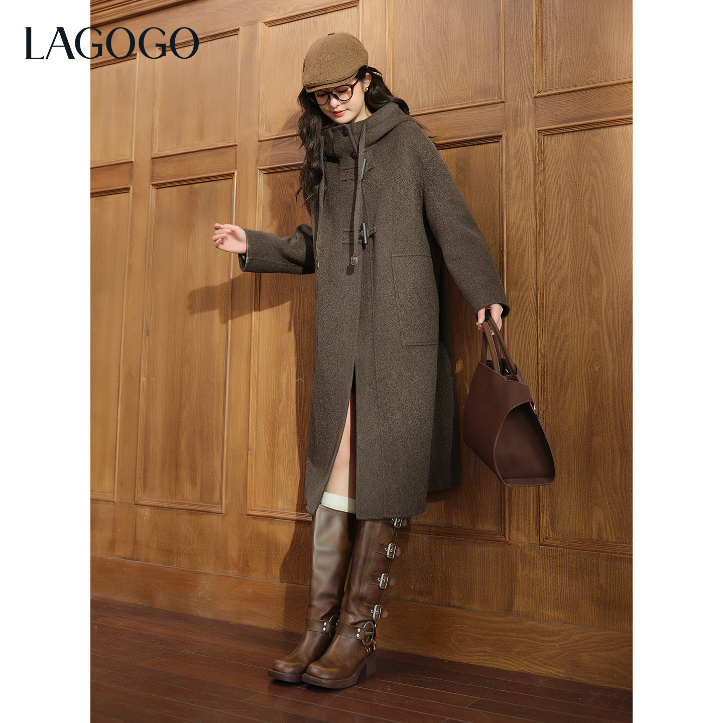 LAGOGO老城旧刊仿牛角扣双面呢女拉谷谷2025冬新款连帽学院风大衣