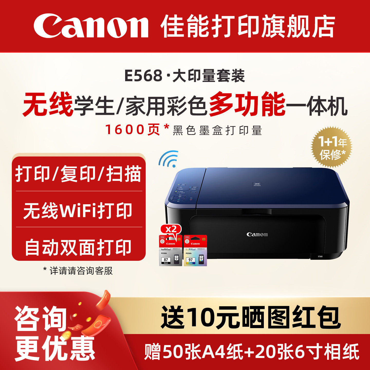 佳能旗舰店E568/E568R彩色A4喷墨打印复印扫描双面一体机 学生家用小型家庭照片手机无线WIFI作业试卷