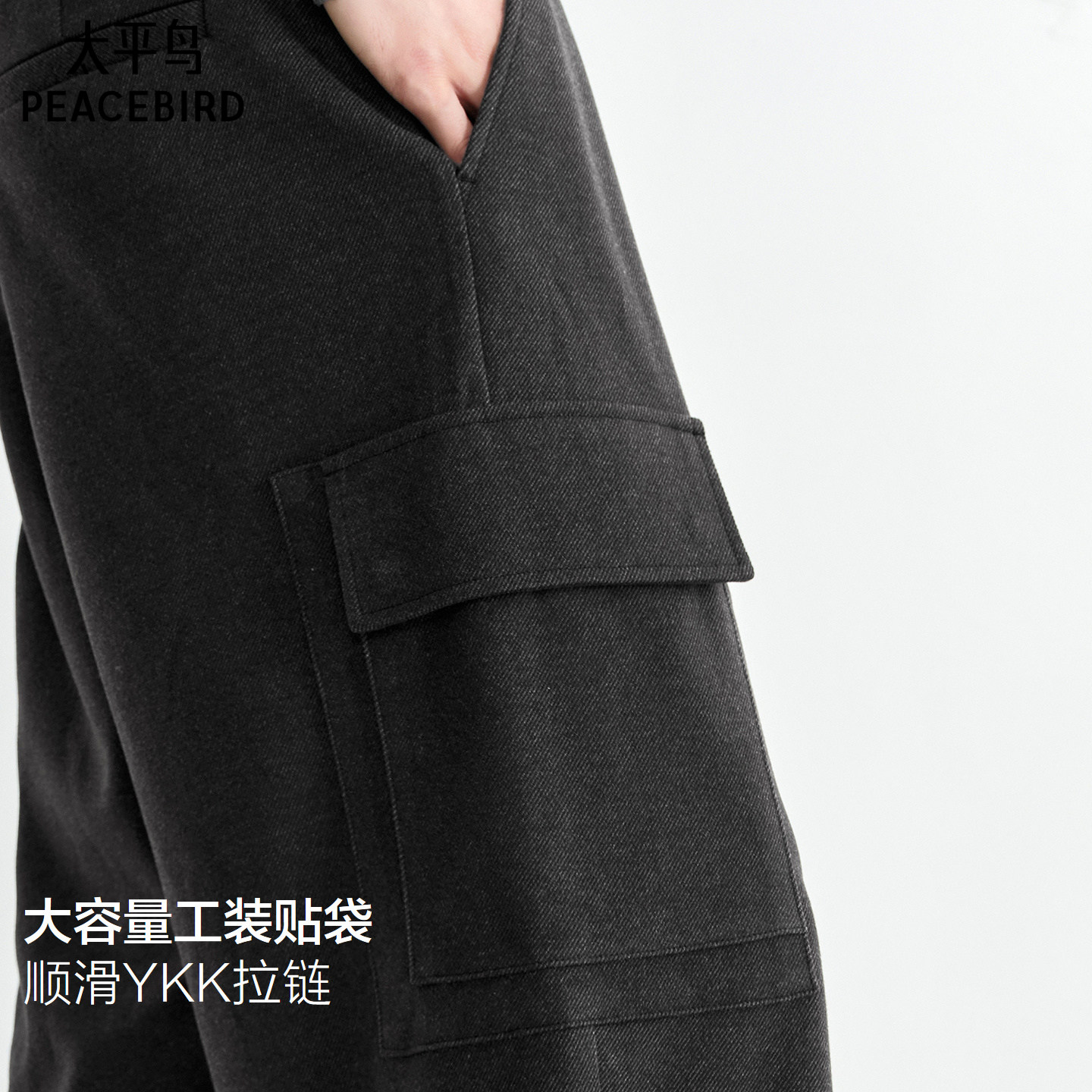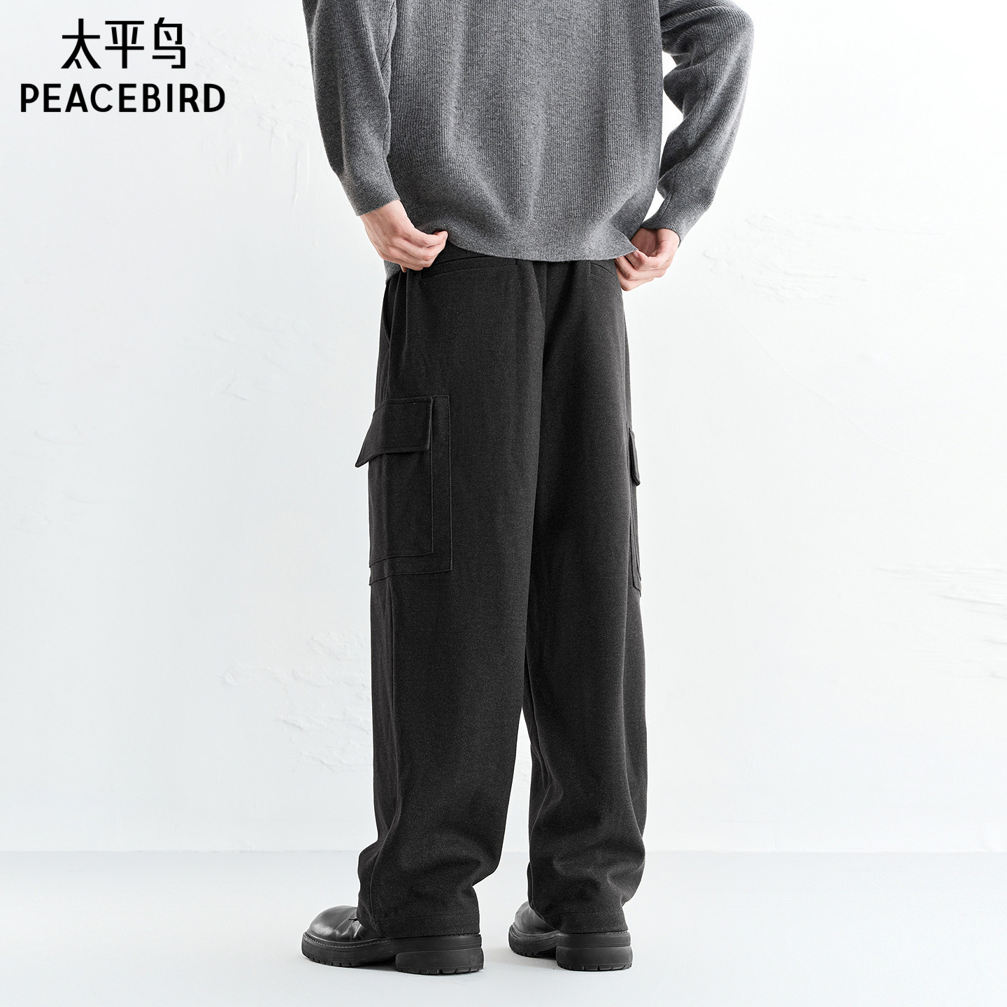 太平鸟男装休闲裤25冬季新款深灰工装质感提花宽松直筒针织长裤