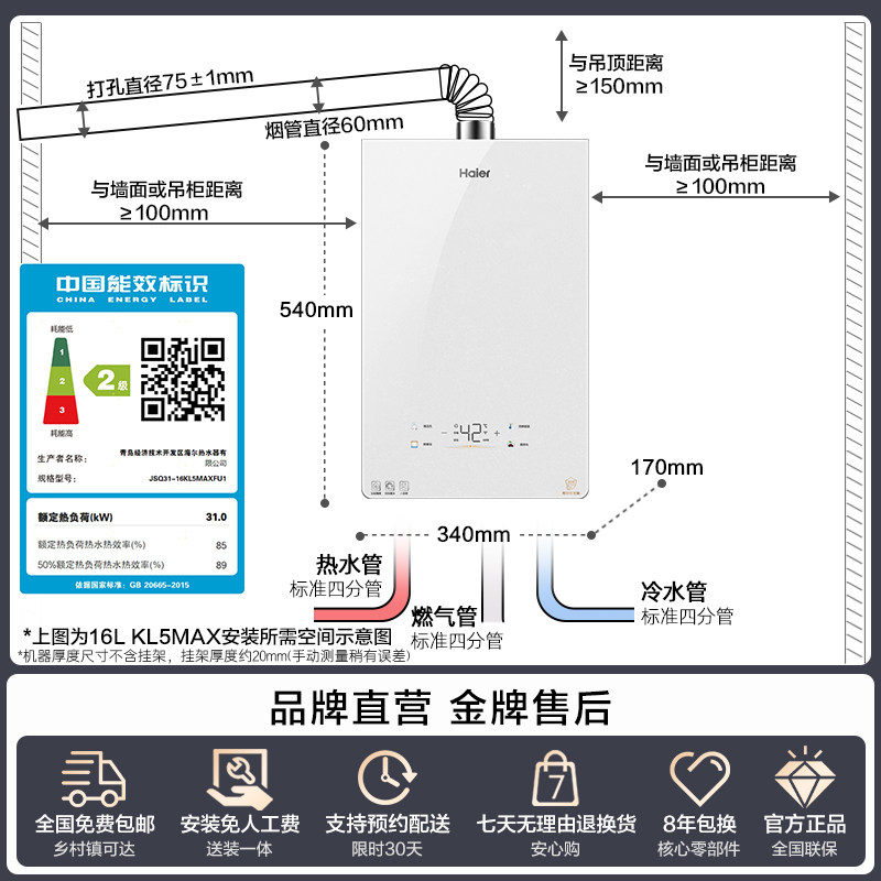 海尔无冷感2.0燃气热水器KL5MAX家用16L天然气恒温静音增压水伺服