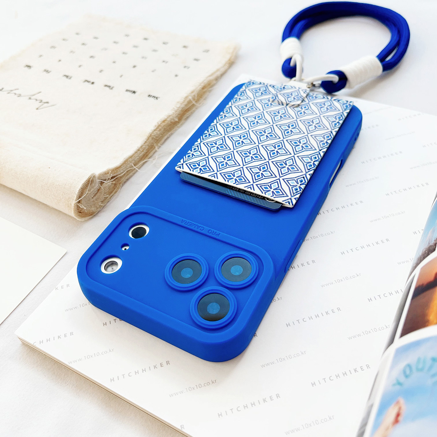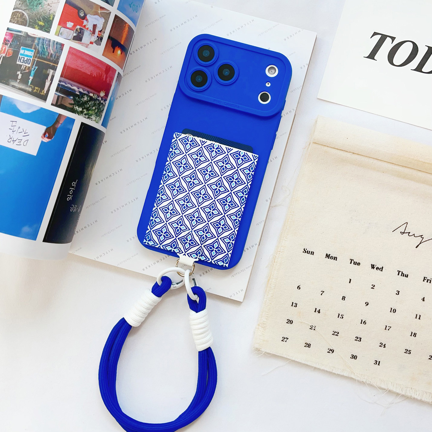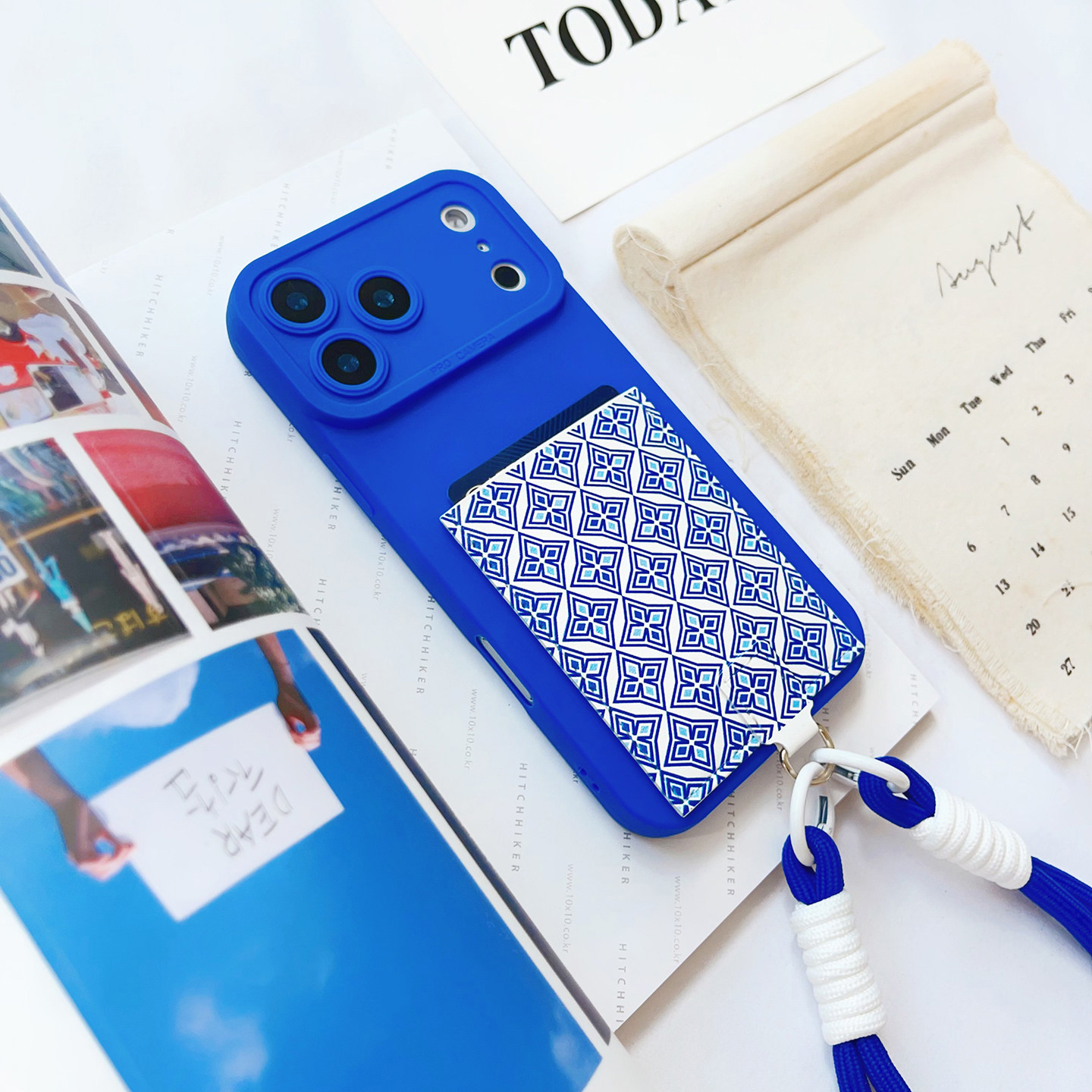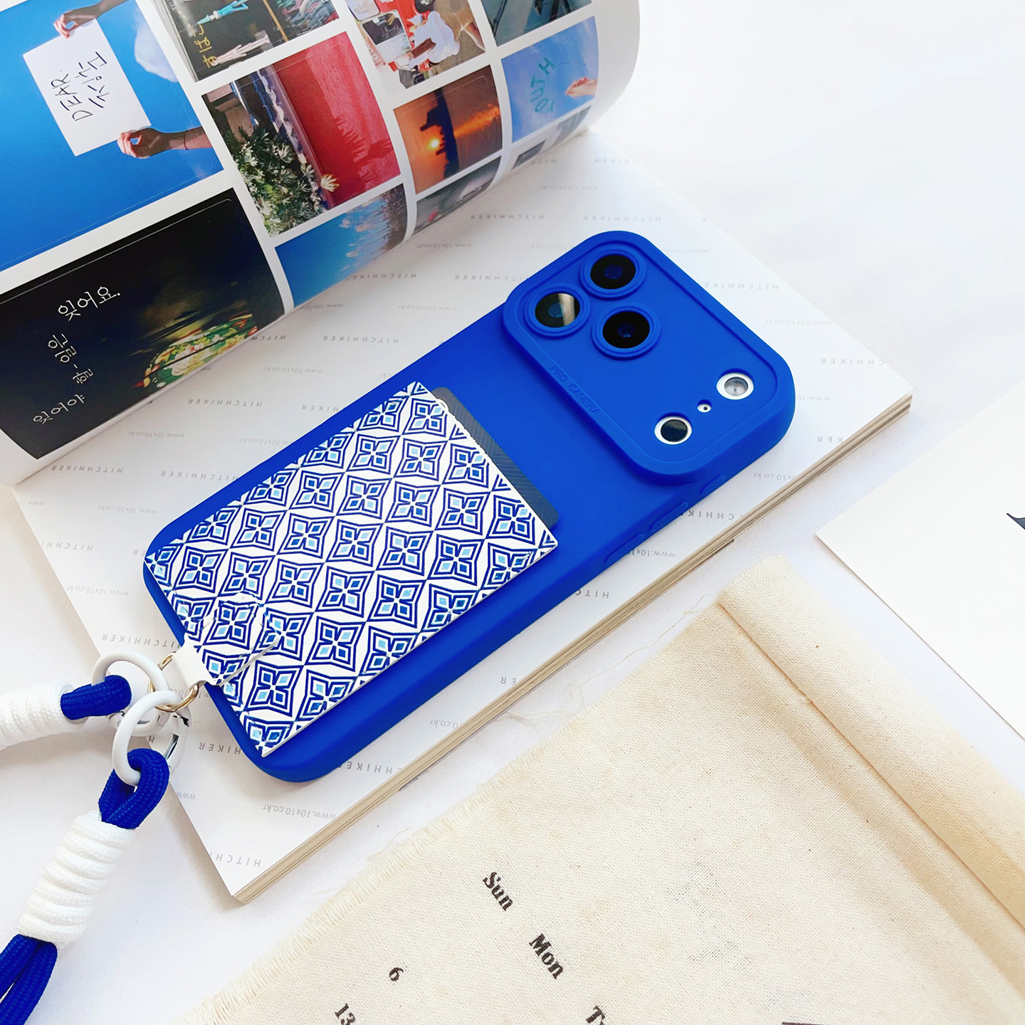 蓝碎花挂绳手机壳带卡包苹果17promax装卡身份证16promax旅游便携插卡16/15/14/13/12独立皮质卡套17精孔防摔