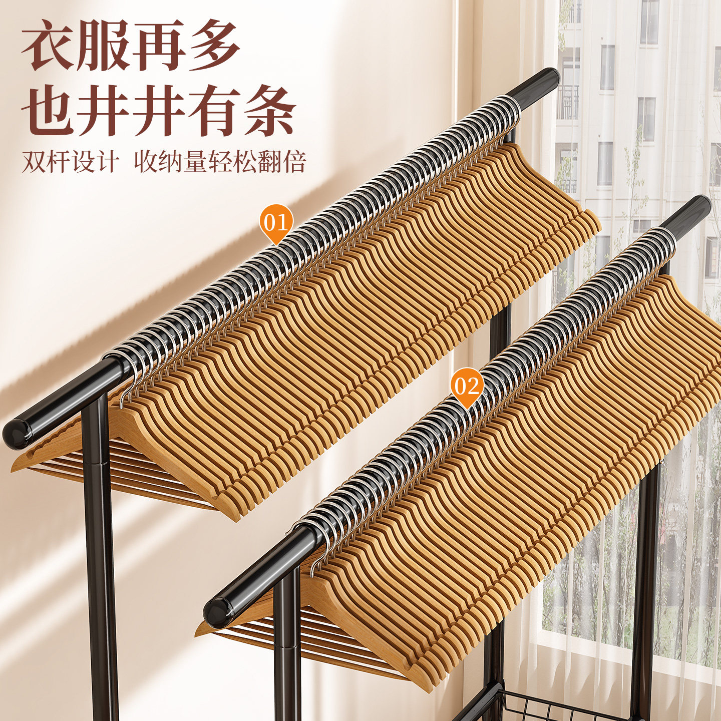 晾衣架落地家用卧室挂衣架宿舍室内双杆双层晒衣服架子简易凉衣杆