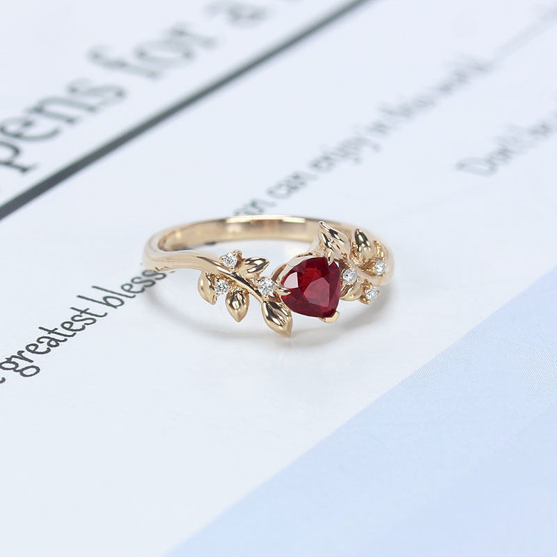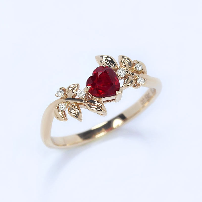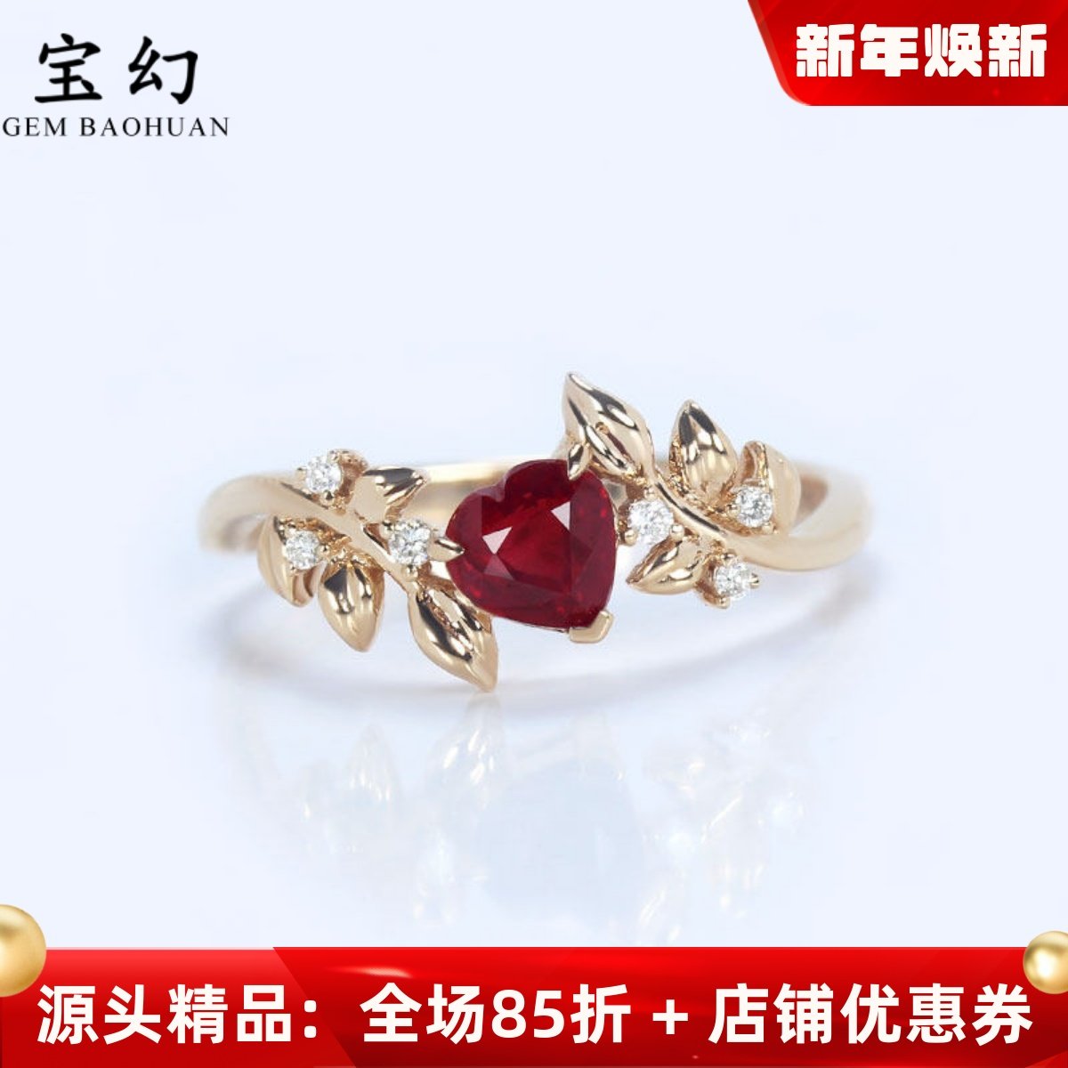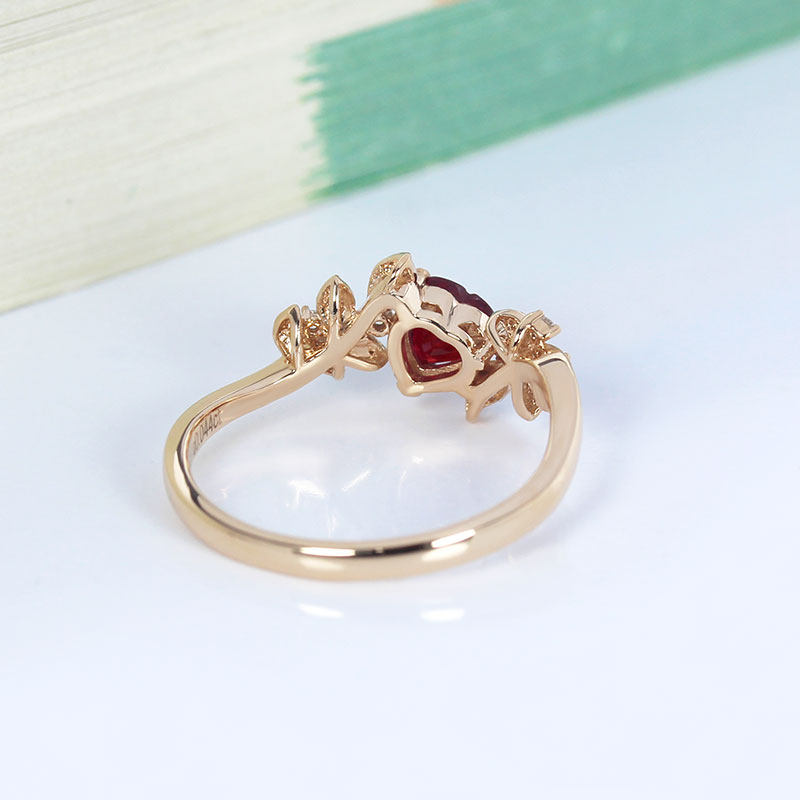 G18K玫瑰金天然红宝石心形复古枝叶戒指 鸽血红色镶钻石手饰女款