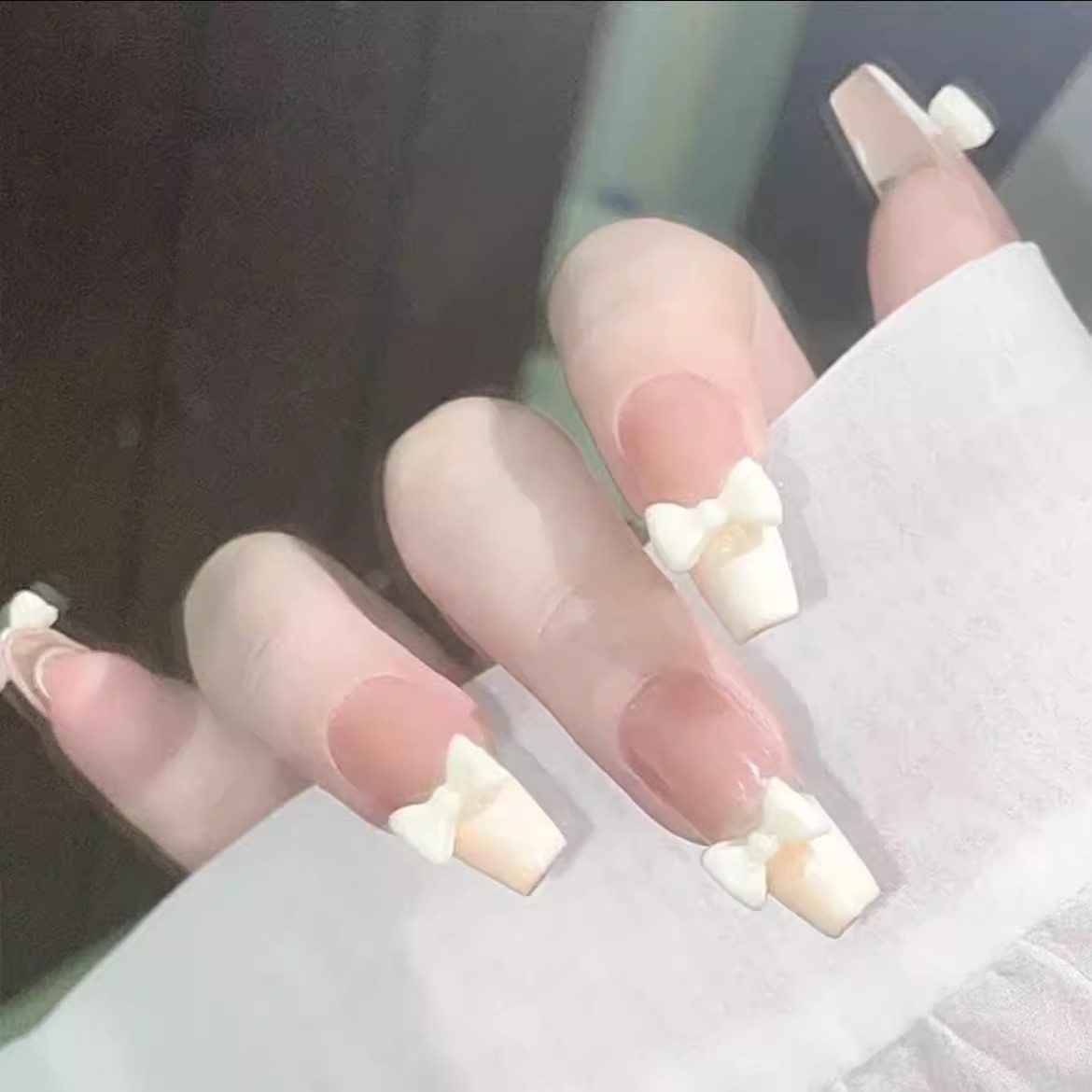夏日显白透绿小蝴蝶穿戴甲美甲中长款法式珍珠蝴蝶结星星防水固态