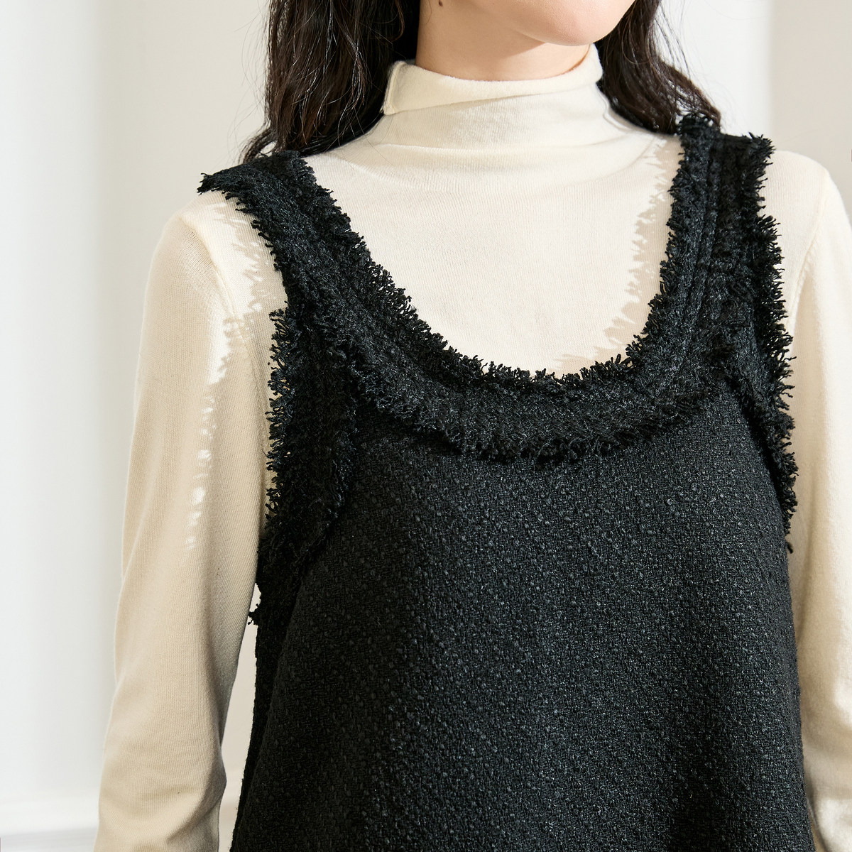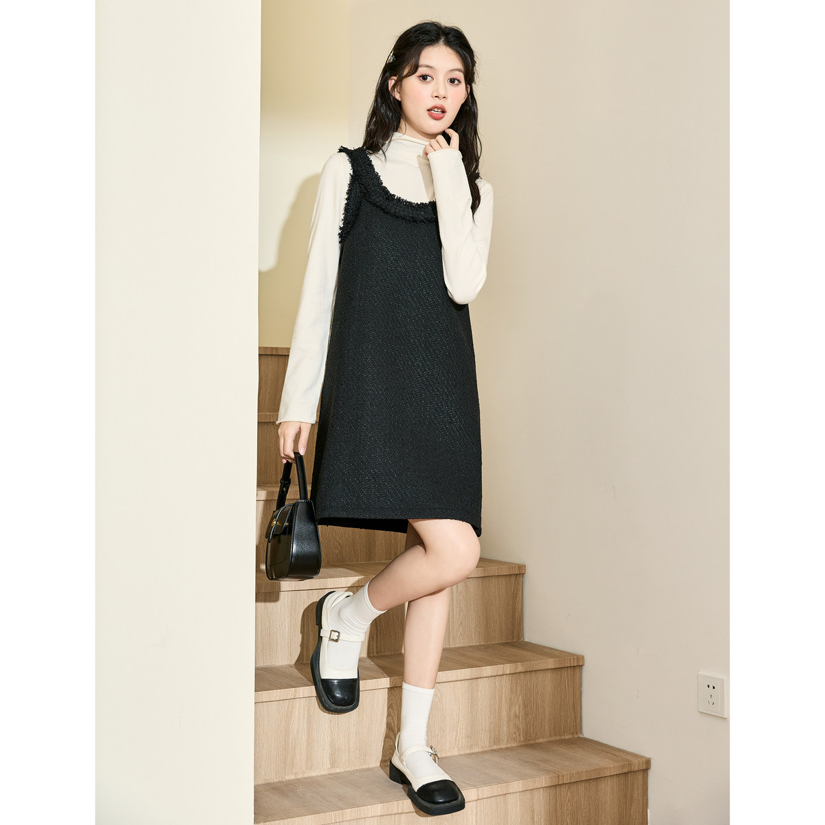 唐狮秋冬新款女半身裙黑色显瘦设计感小香风毛边背带裙小个子TD