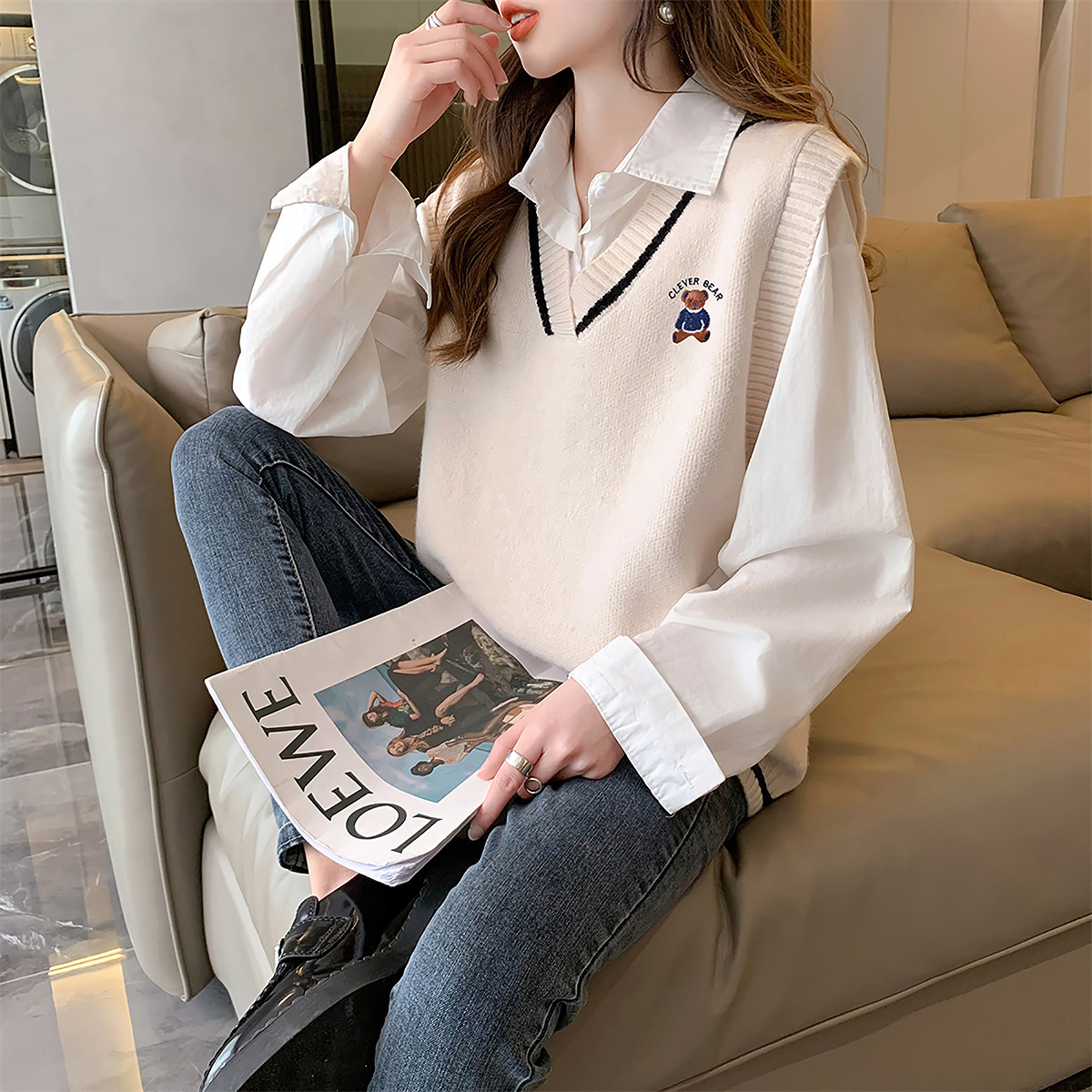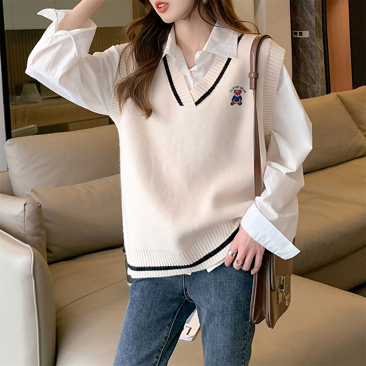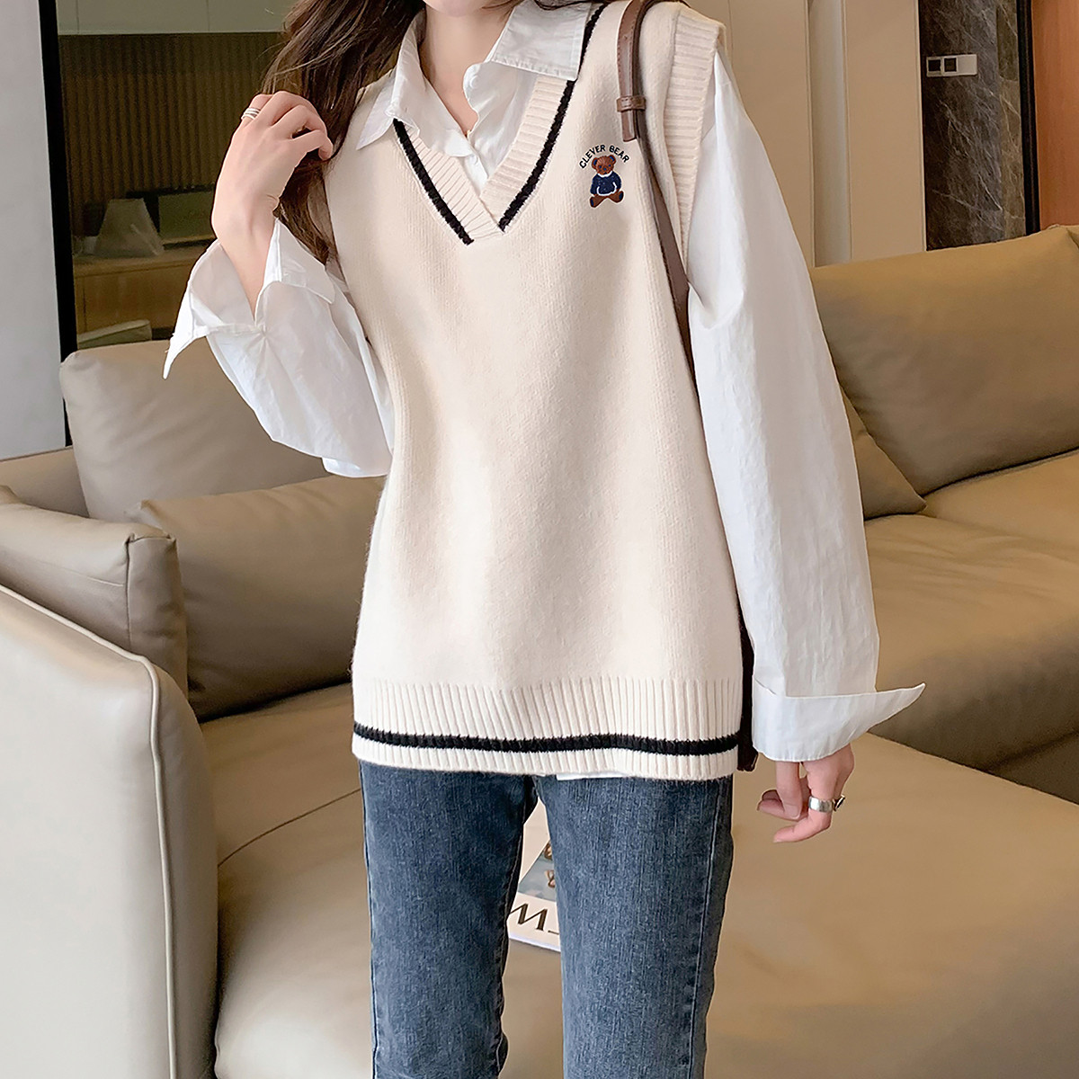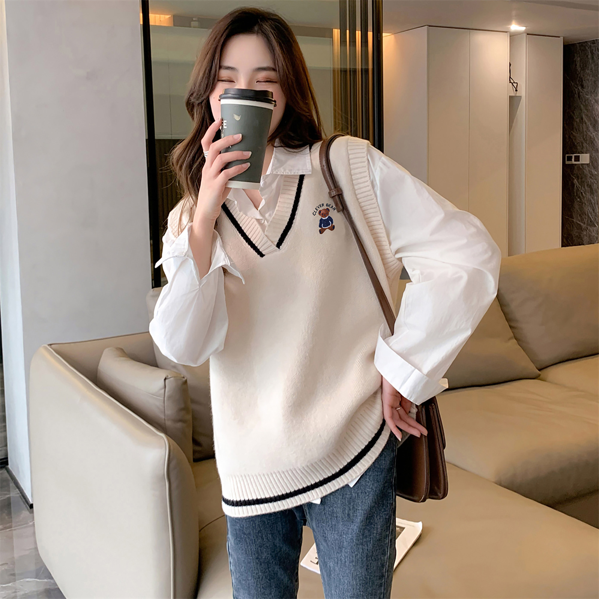唐狮秋冬季女毛衣精致卡通图案V领套头马甲简约宽松百搭毛线衫tu