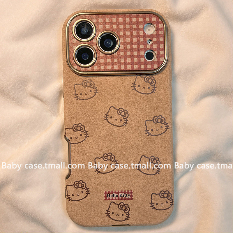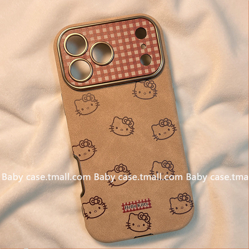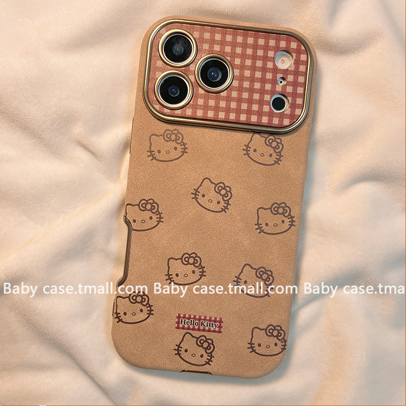 秋冬复古棕色格纹大视窗KT猫适用苹果手机壳