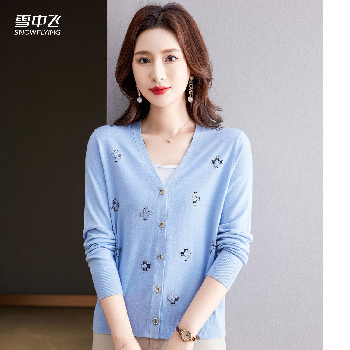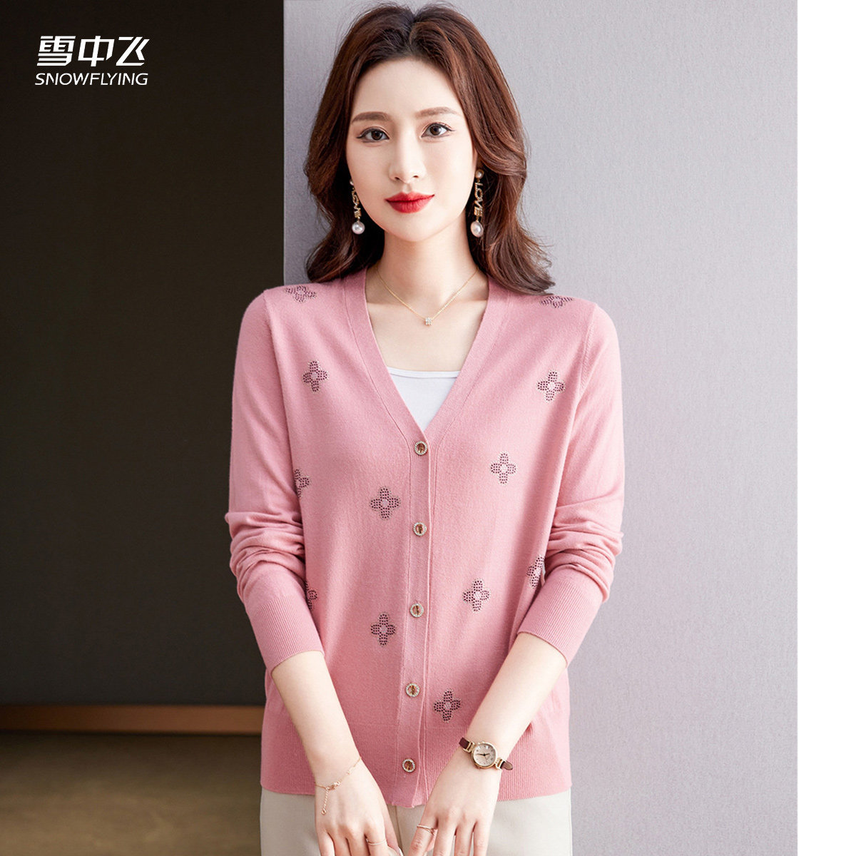 【花朵烫钻工艺女士开衫】25秋冬针织V领长袖外套温柔甜美上衣