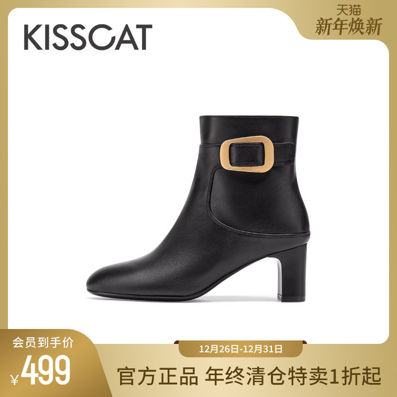 KISSCAT接吻猫秋季新款真皮尖头复古时装靴女羊皮粗高跟黑色短靴