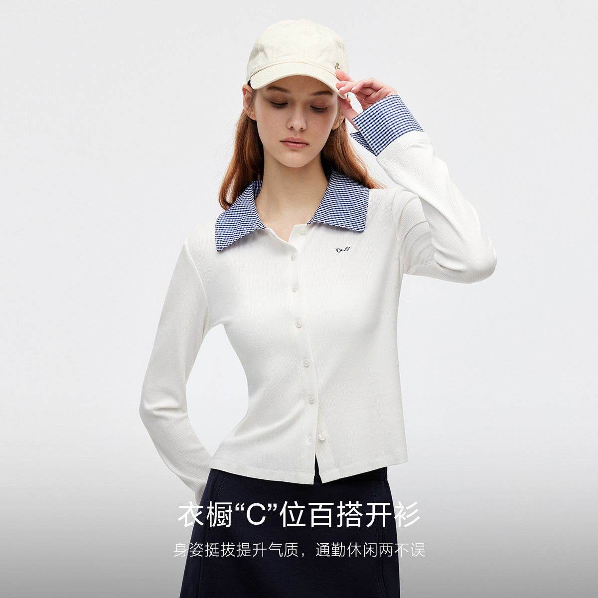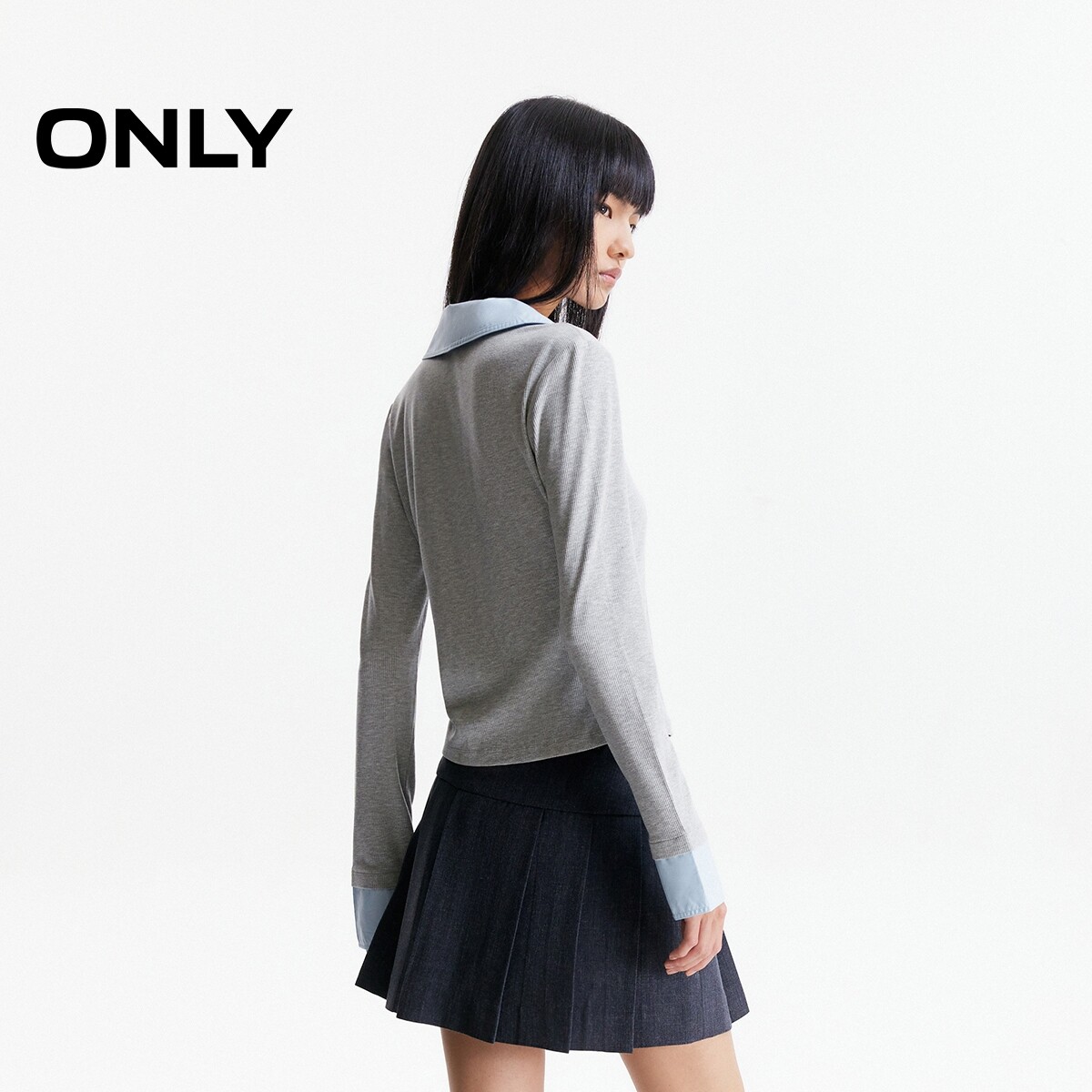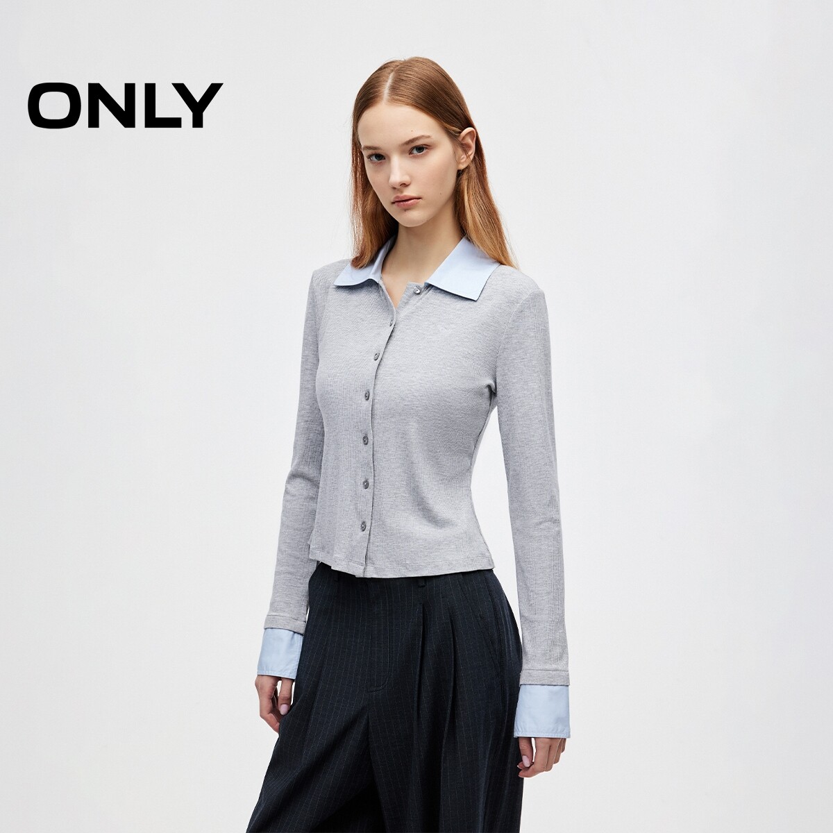 ONLY2026春季新款衬衫拼接领口设计修身翻领长袖正肩上衣T恤女