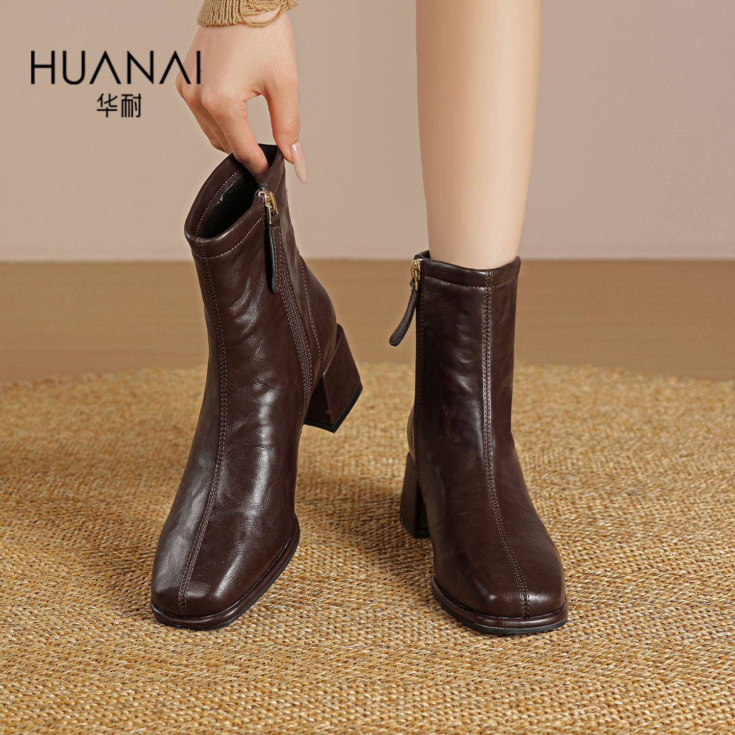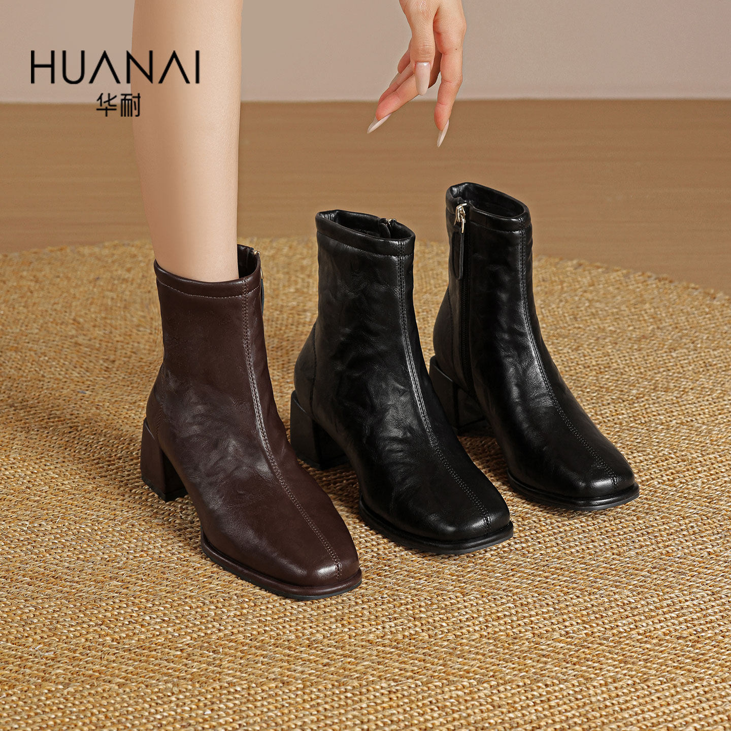 华耐方头复古瘦瘦靴女加绒2025秋冬新款短靴粗跟小踝靴英伦风单靴