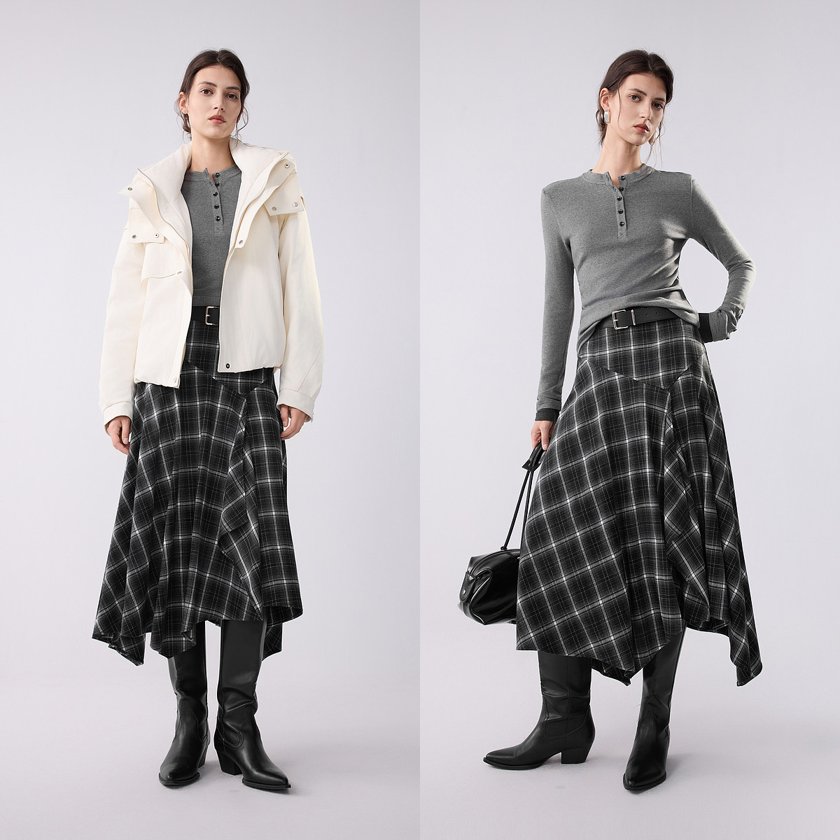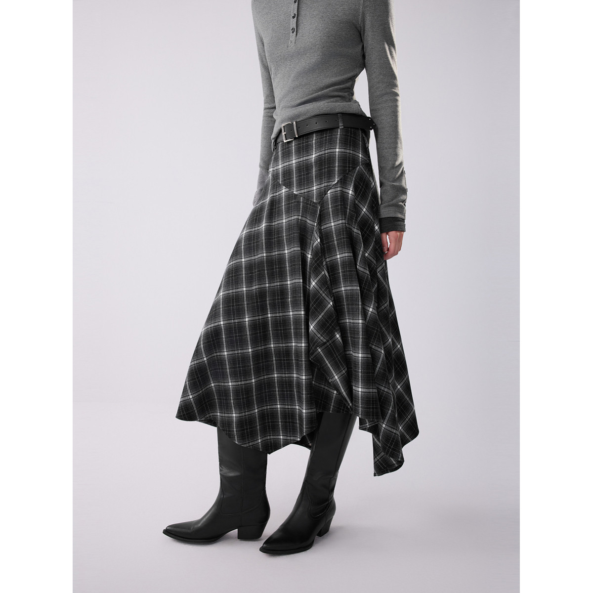 三福格子长裙女2025新款冬季气质流苏摆不规则半身裙子女装509092