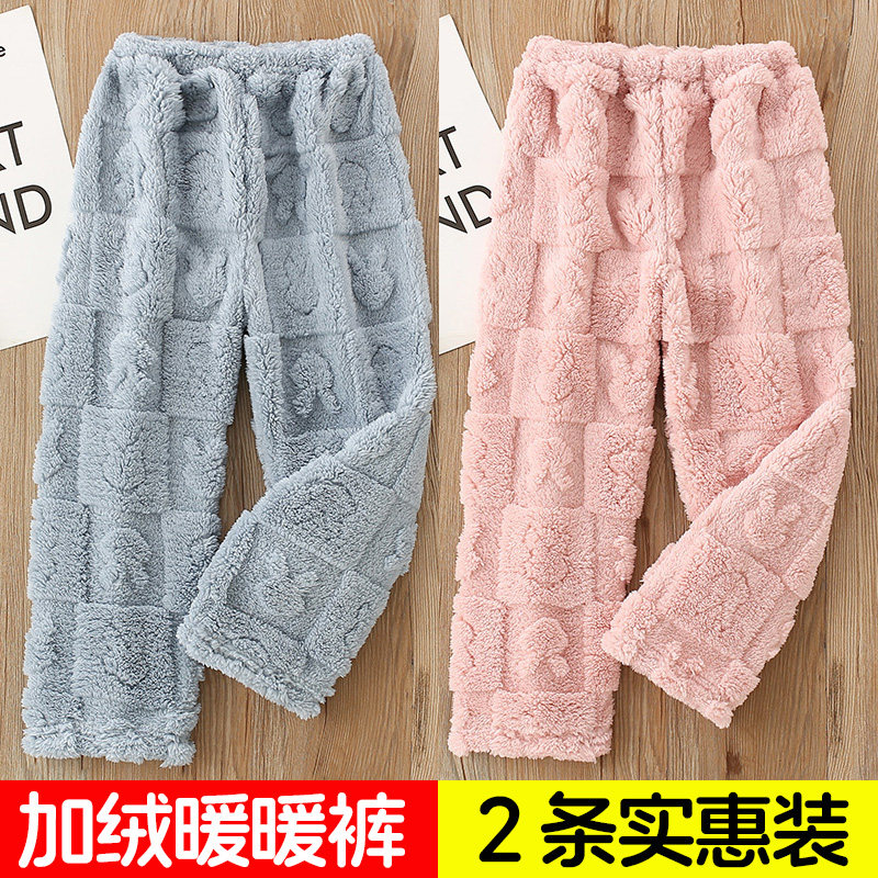 儿童法兰绒睡裤秋冬季珊瑚绒加厚保暖男女休闲家居裤加绒居家蓝色