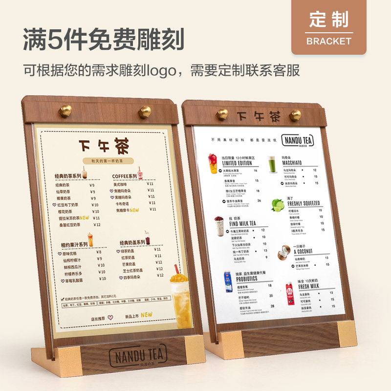 胡桃木菜牌 立式铆钉插牌 桌面餐牌前台展示板产品介绍自助餐标签