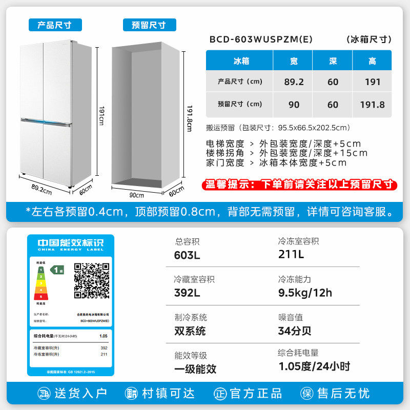 美的570+/606对开双开门两门大容量家用冰箱一级节能风冷无霜超薄