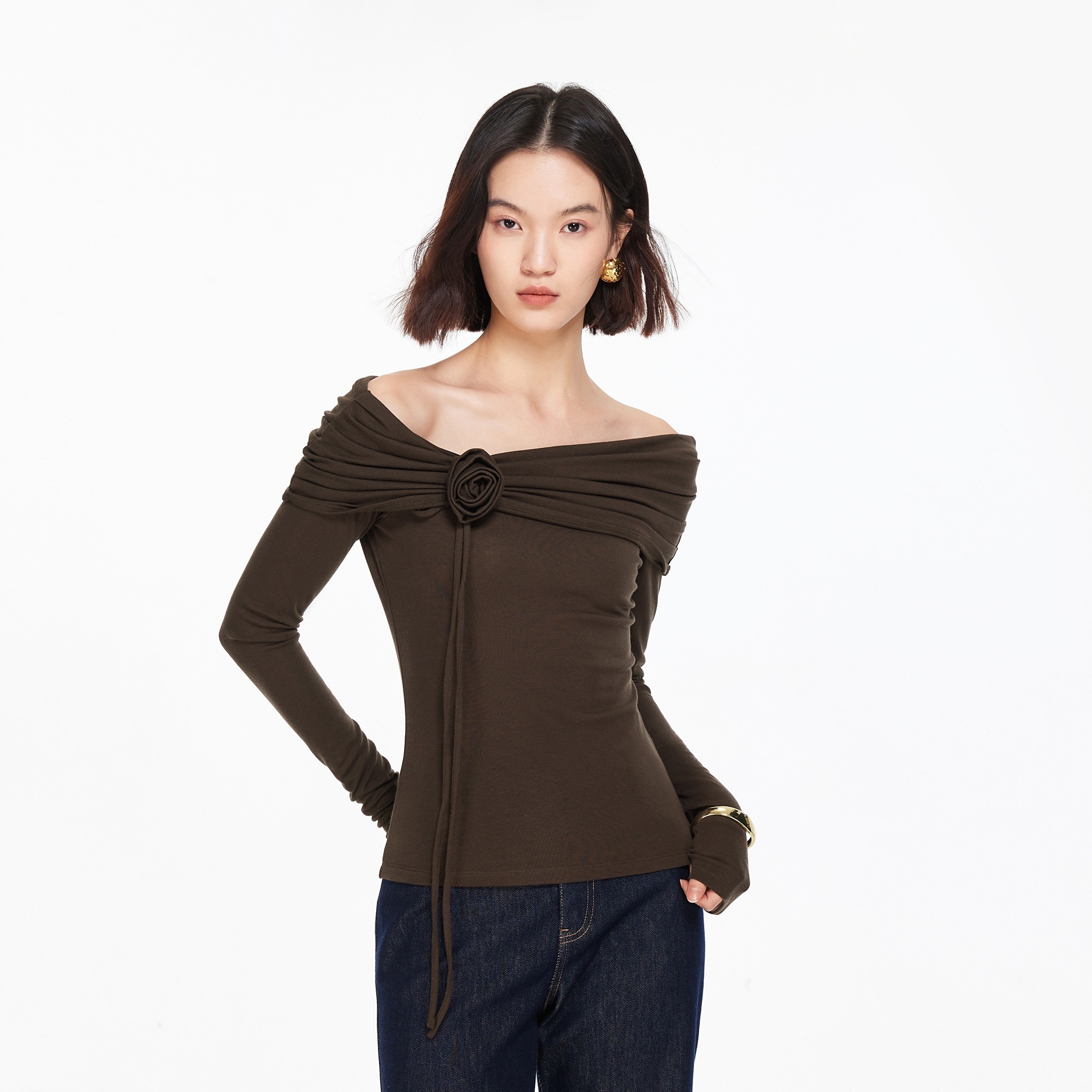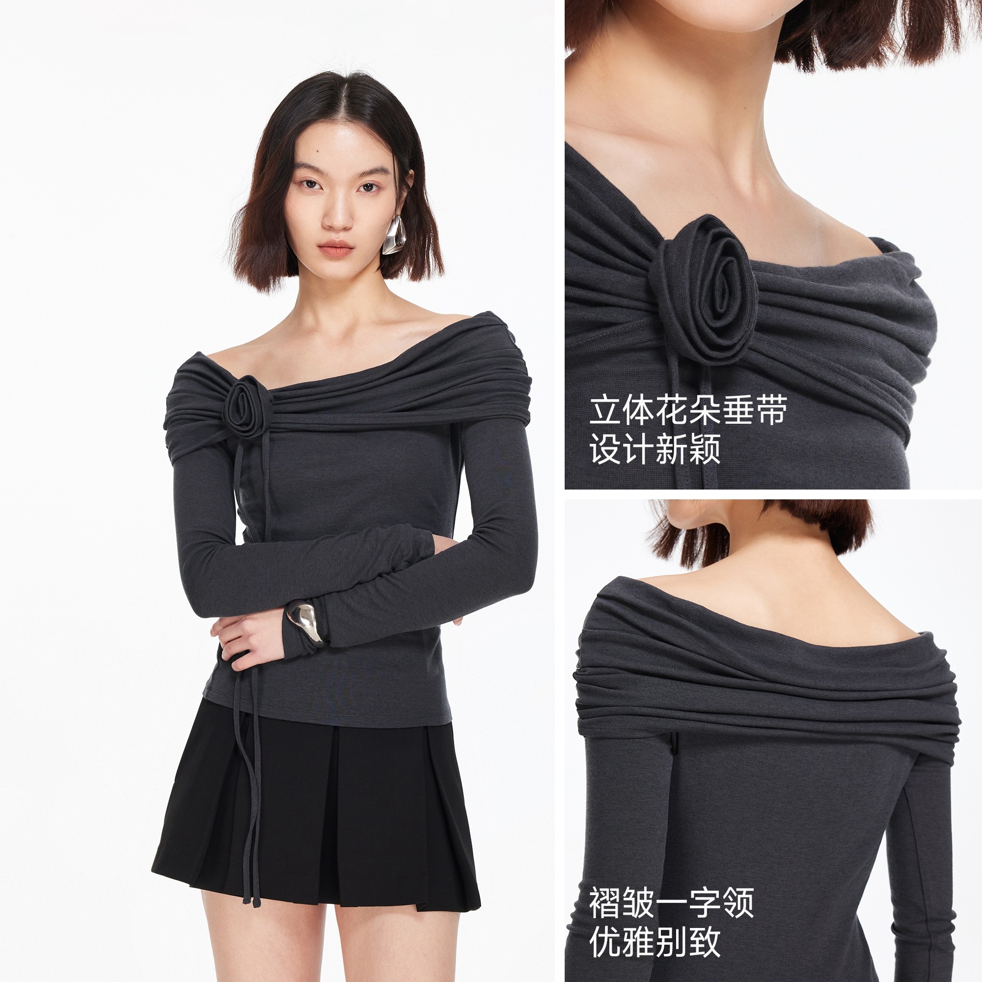 褶皱一字领,立体花朵垂带,优雅别致。
