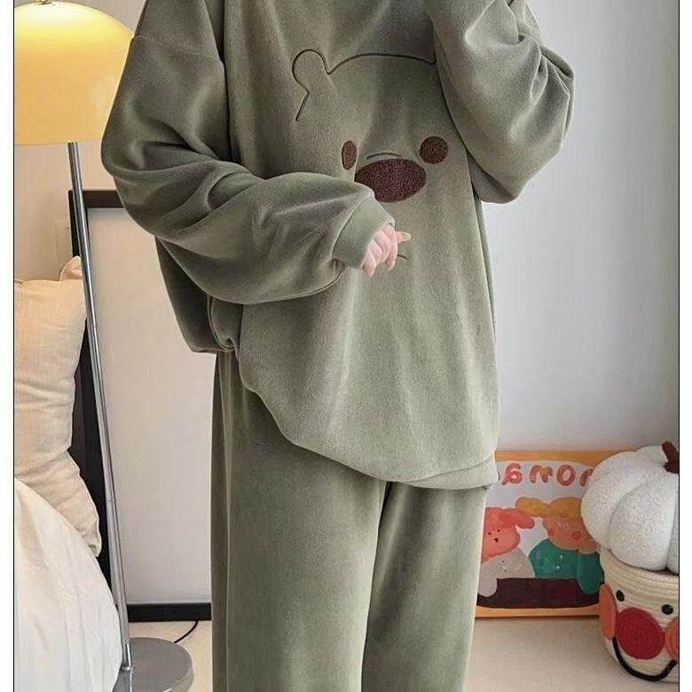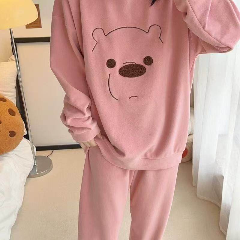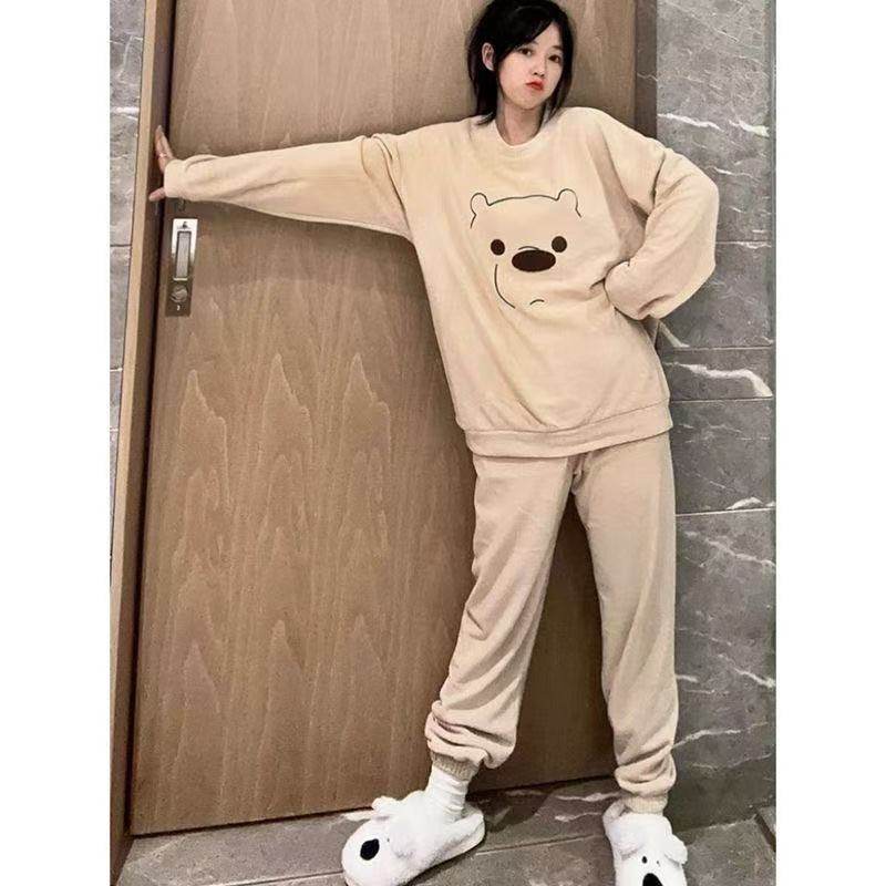 睡衣女春秋款长袖长裤德绒卡通可爱宽松版家居服套装可外穿