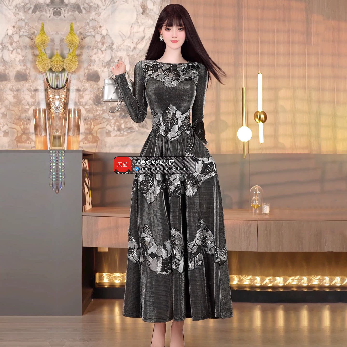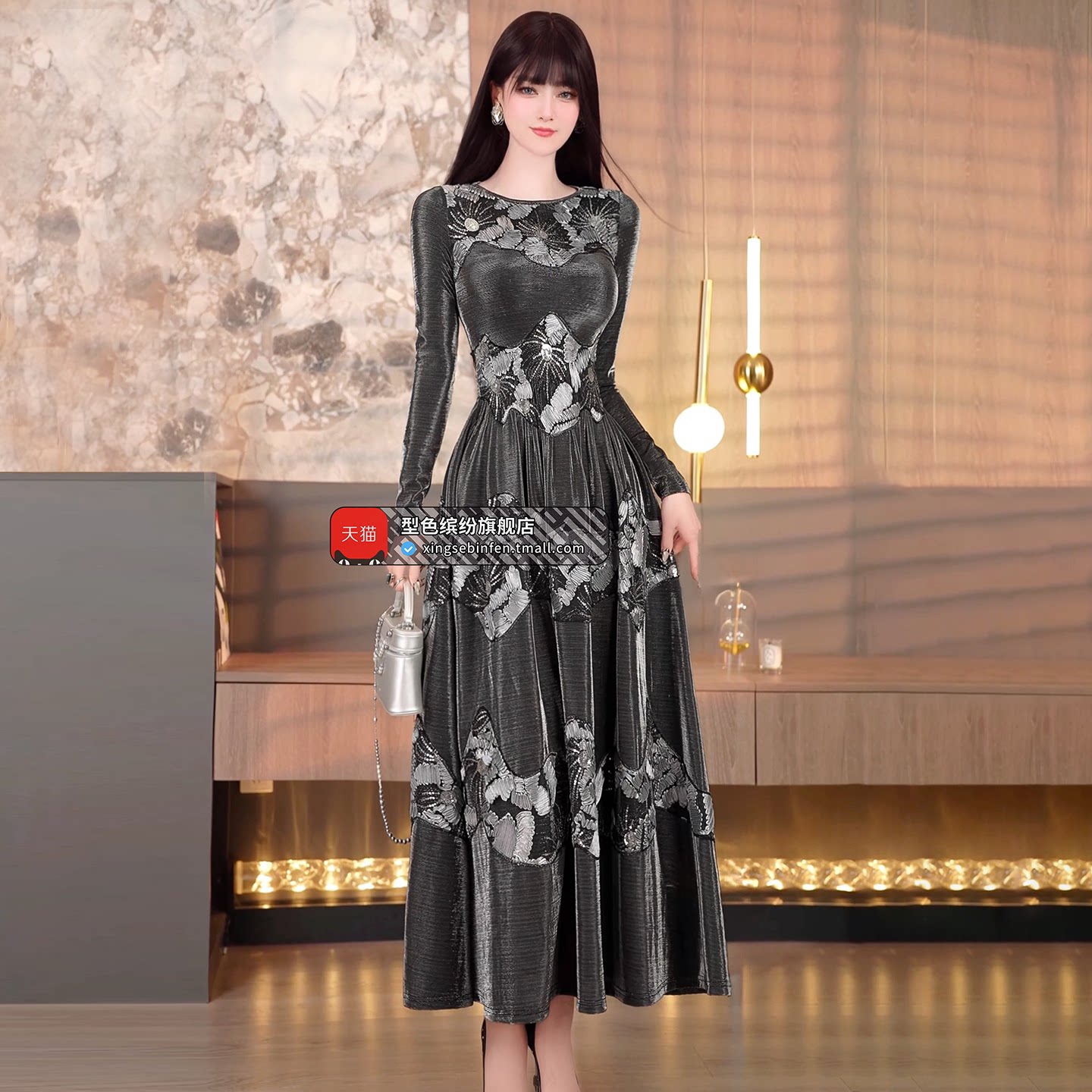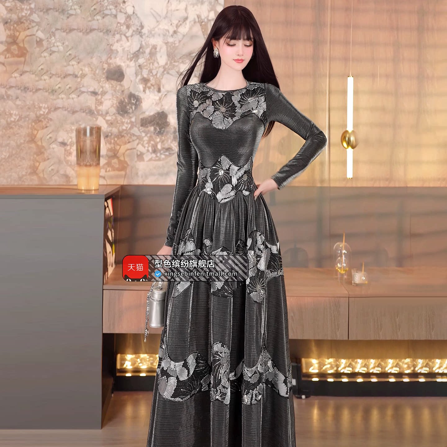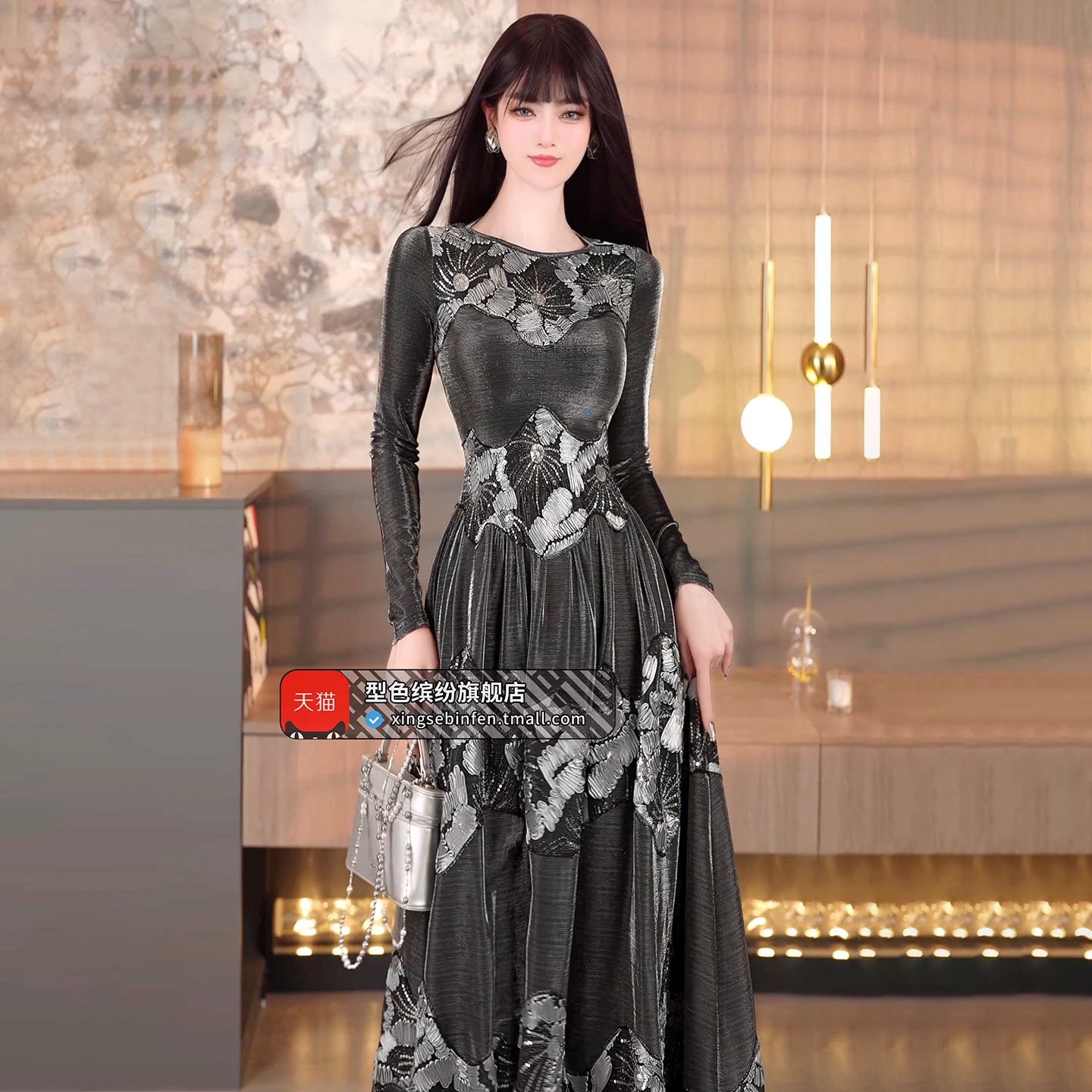 开春时尚洋气拼接提花连衣裙2026新款度假风气质减龄过膝长裙