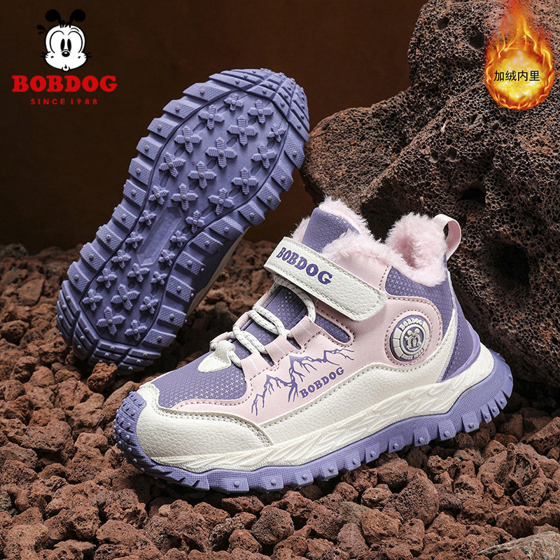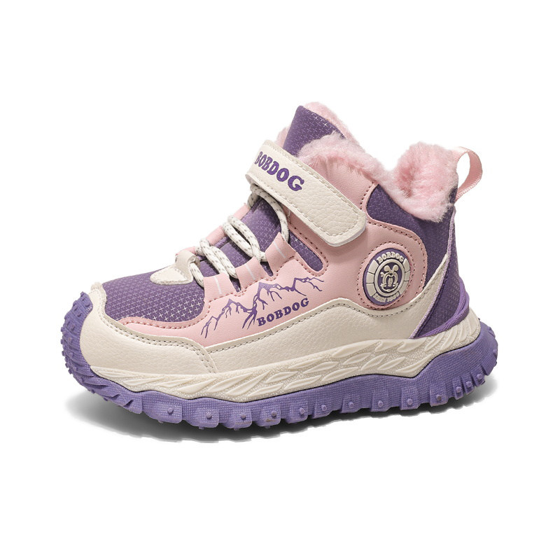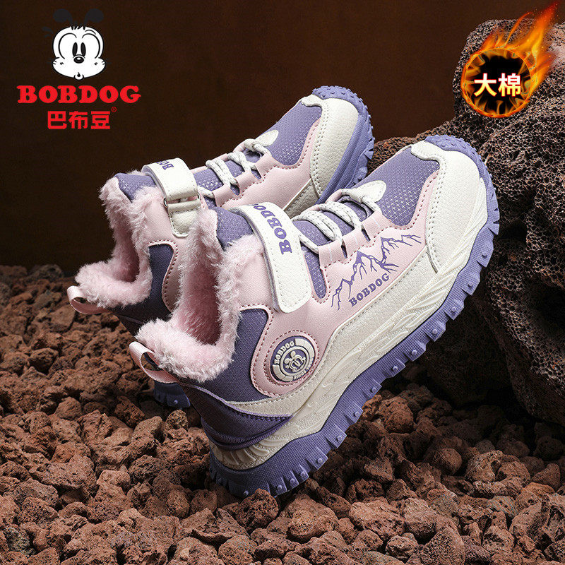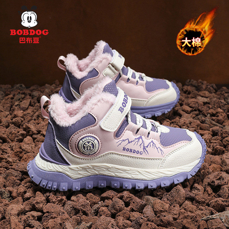 巴布豆女童冬季加绒加厚大棉鞋新款东北抗寒儿童皮面防水运动鞋
