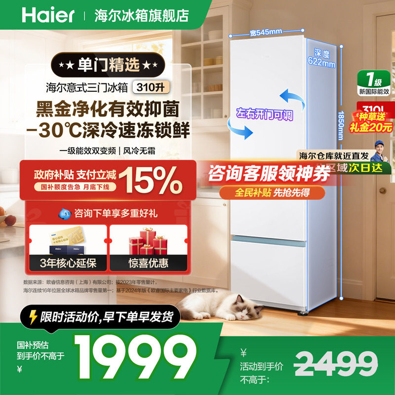 【国补告急】海尔冰箱310升三开门一级变频节能小型家用官方正品