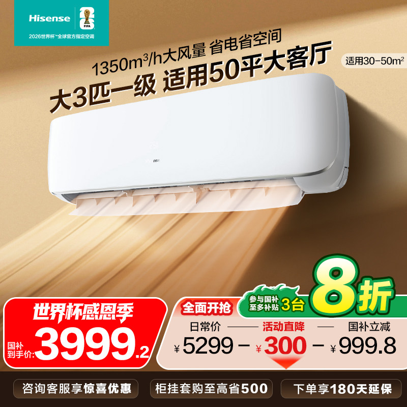 海信空调挂机大3匹易省电家用一级能效变频挂式以旧换新补贴