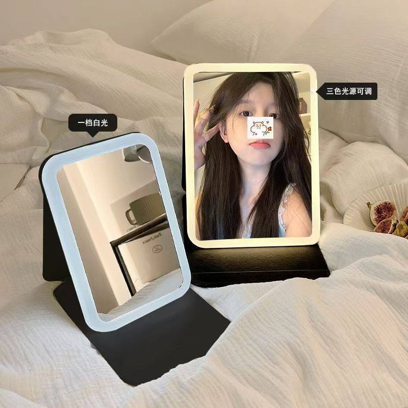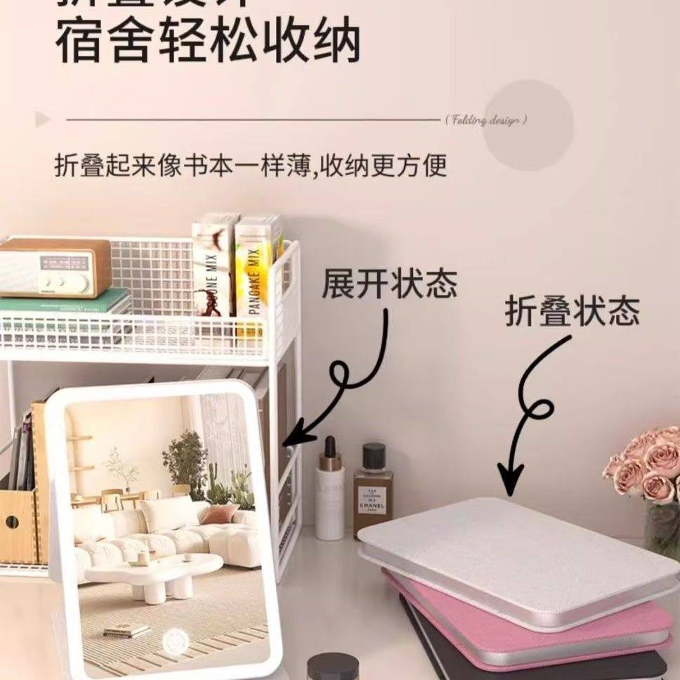 led轻奢带灯化妆镜子可爱桌面便携小家用女台式梳妆发光折叠镜