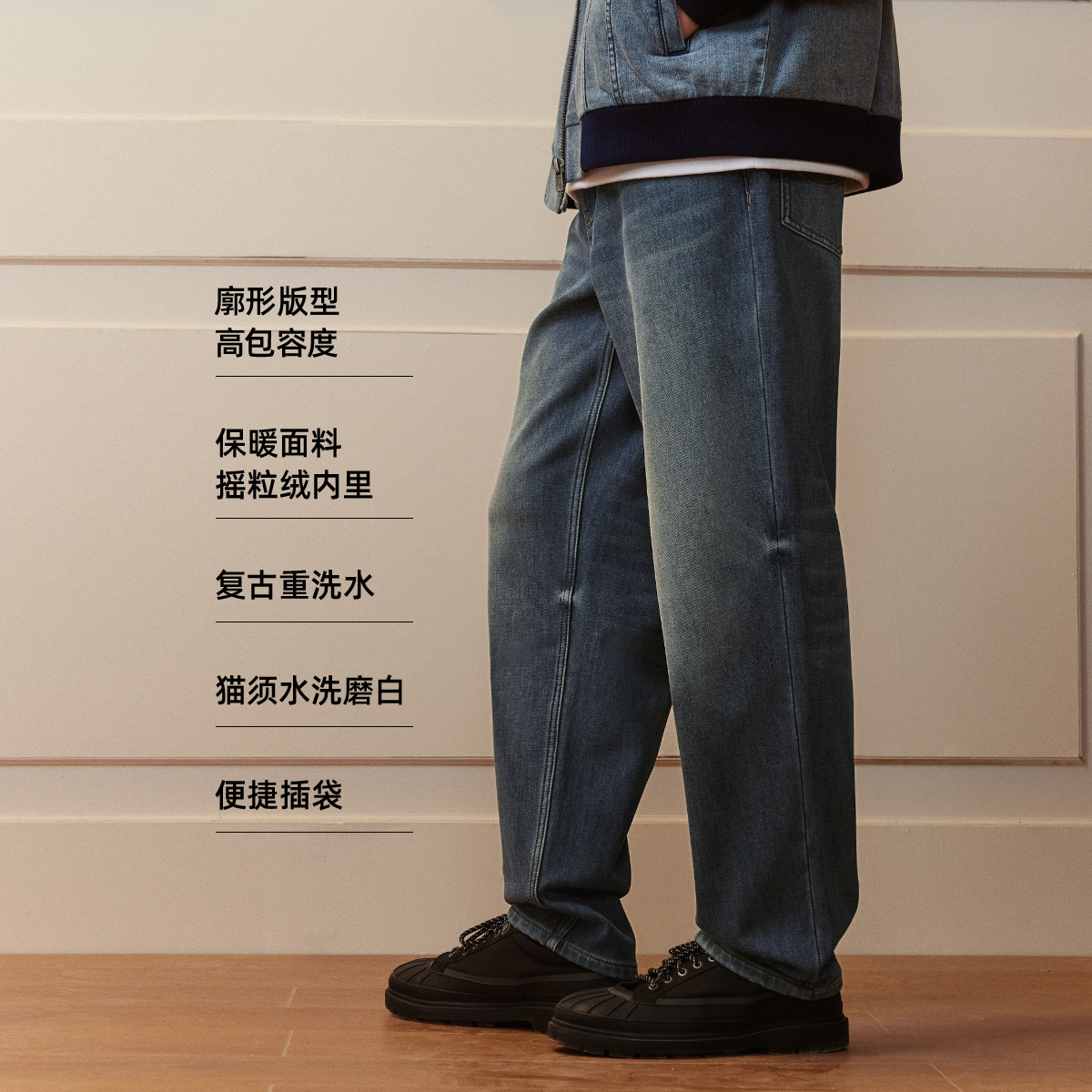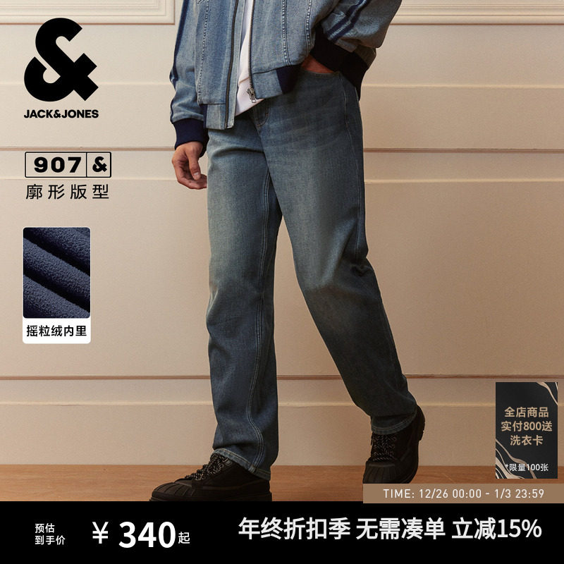 907杰克琼斯男装士冬季宽松复古阔腿牛仔裤加绒保暖长裤子男款