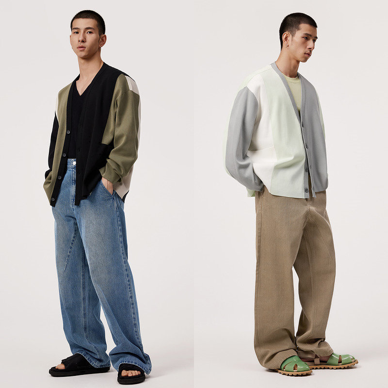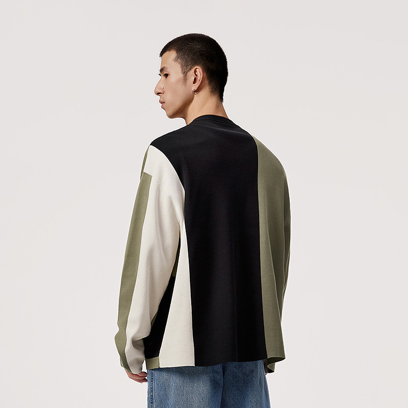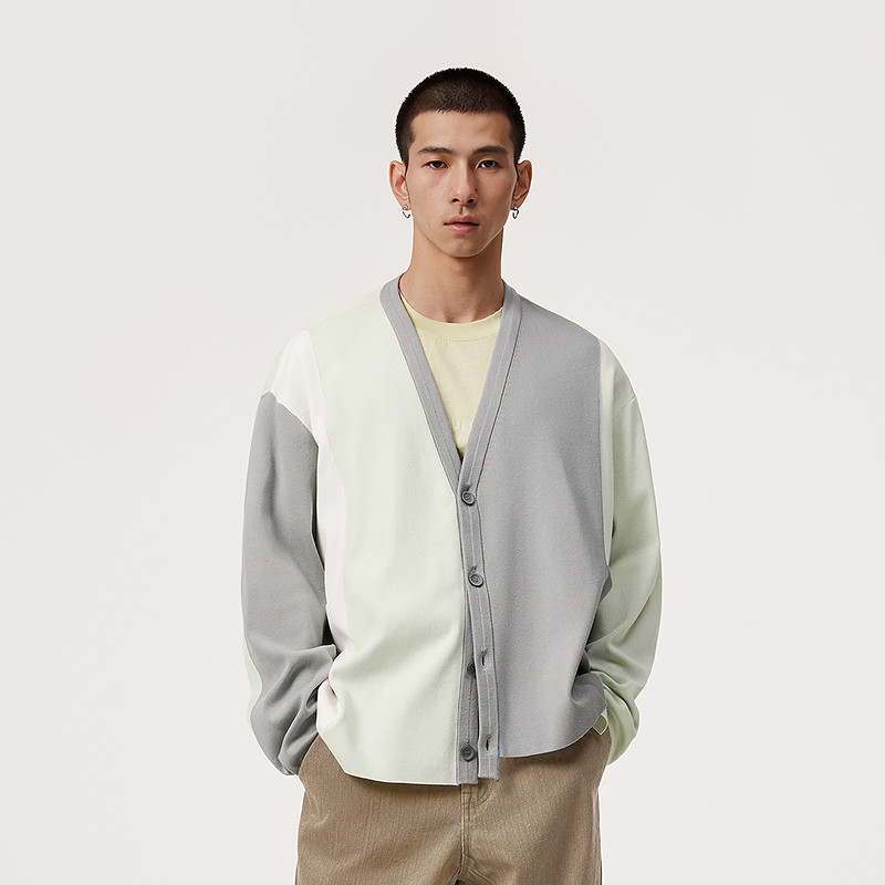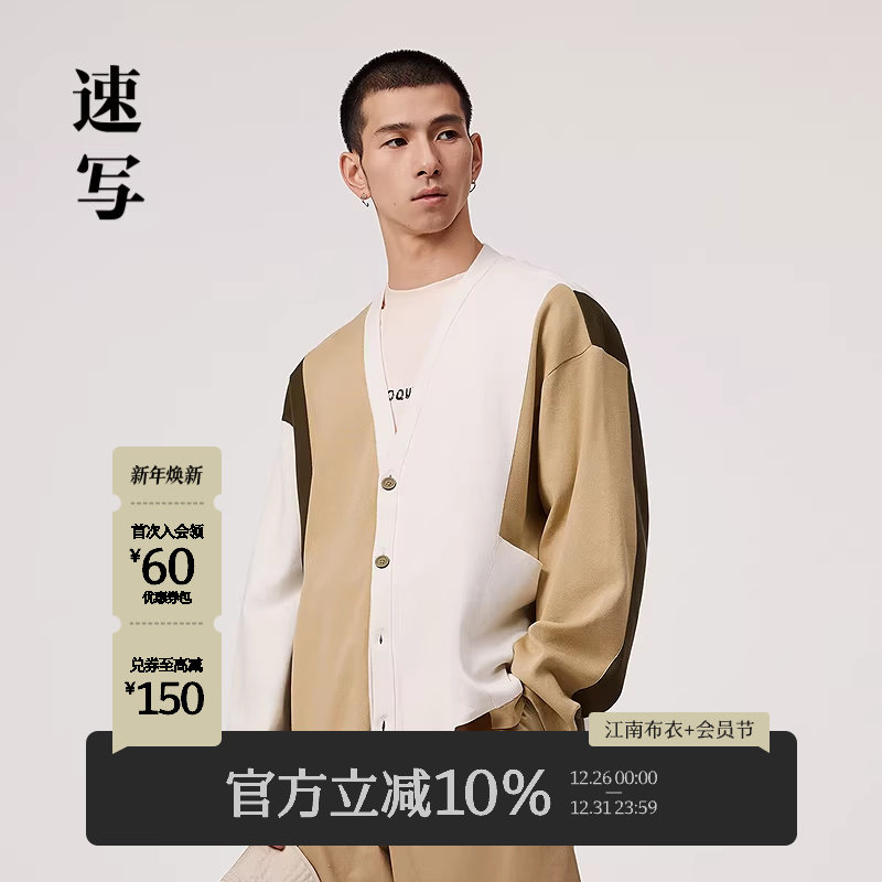 速写男装春秋季新款针织开衫大色块撞色宽松V领时尚复古拼接毛衫