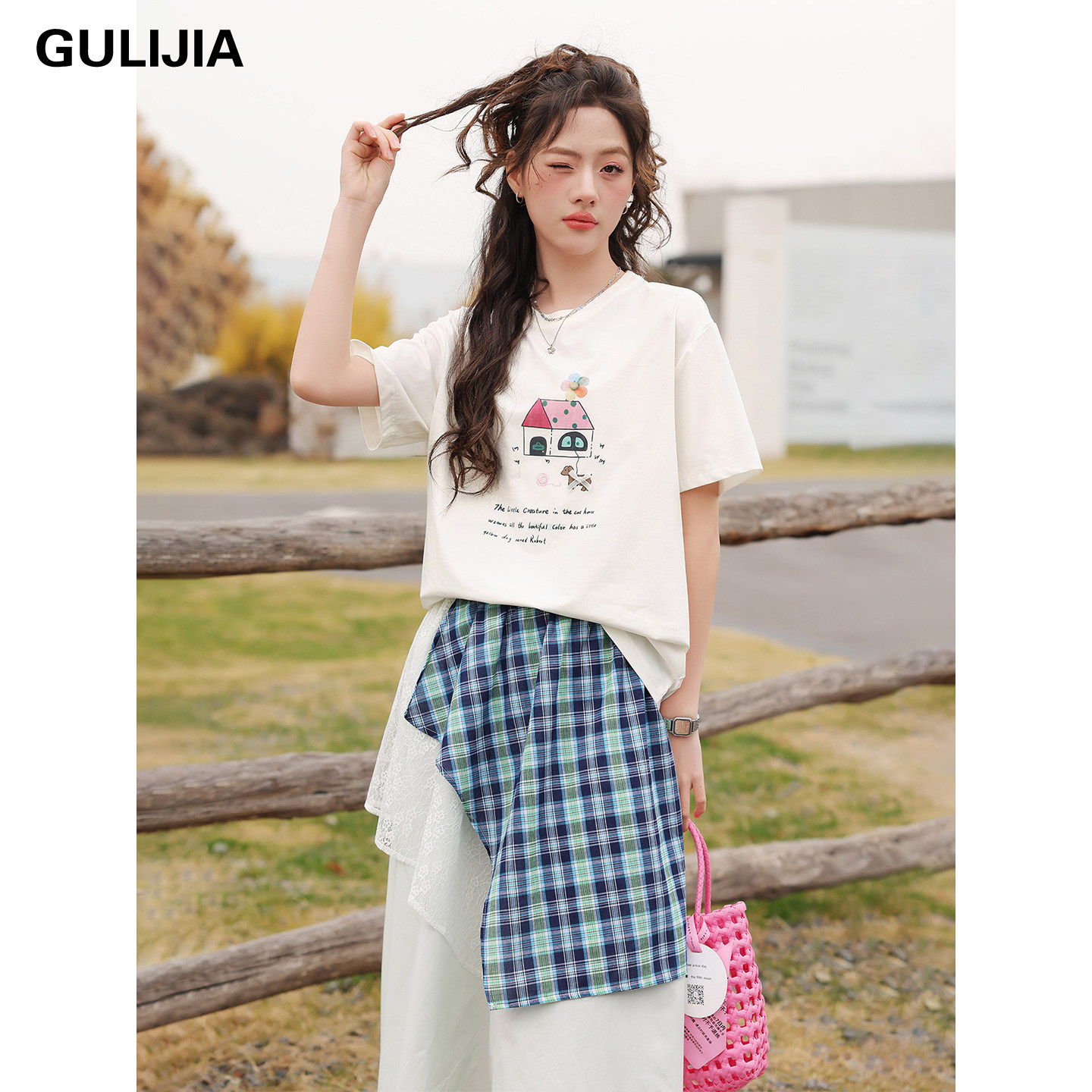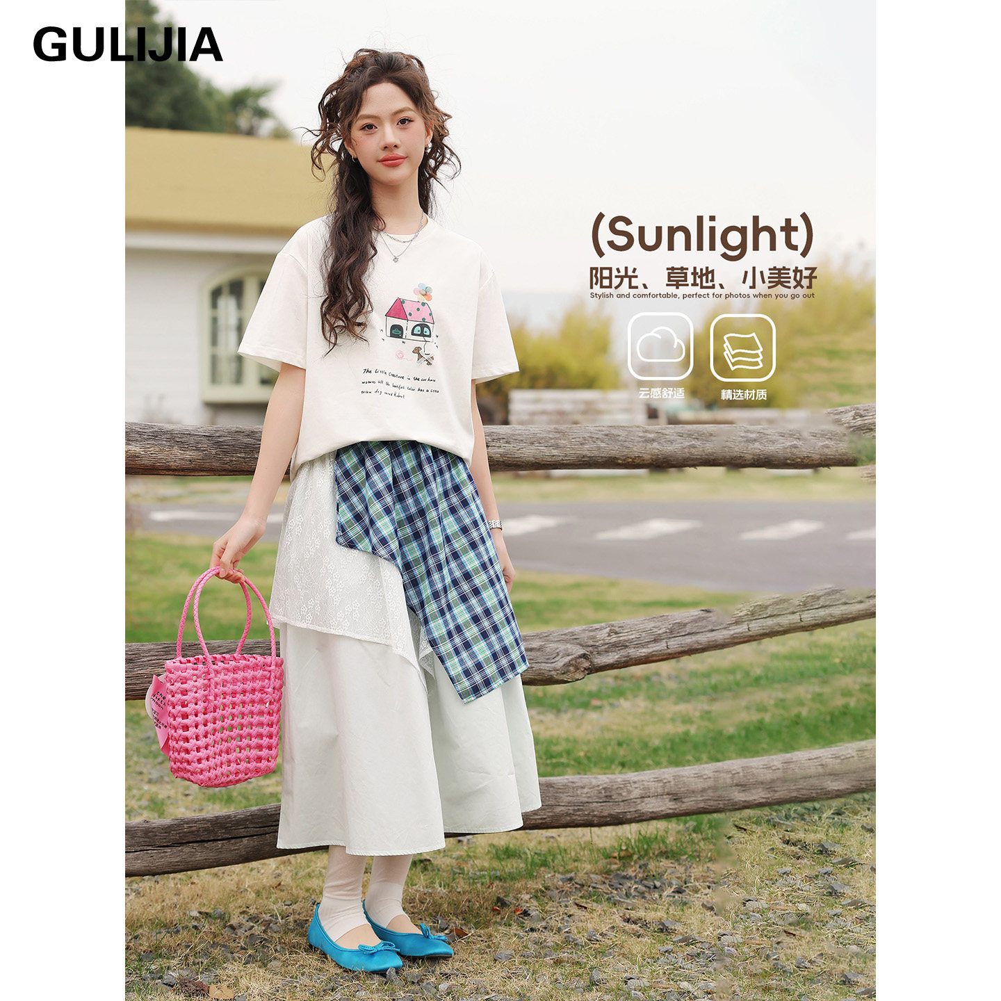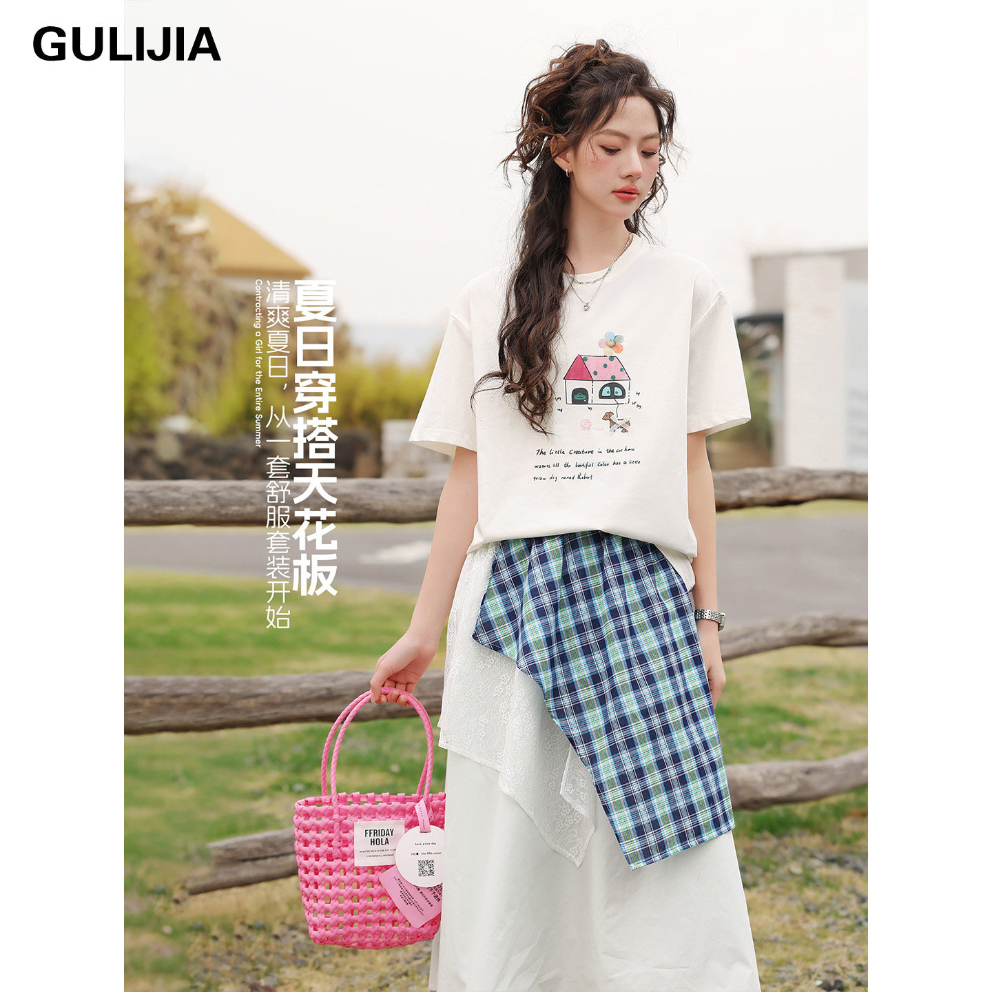 古力家短袖甜美风印花T恤半身裙套装女大童夏季新款初中生两件套