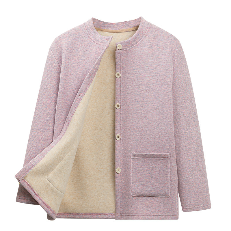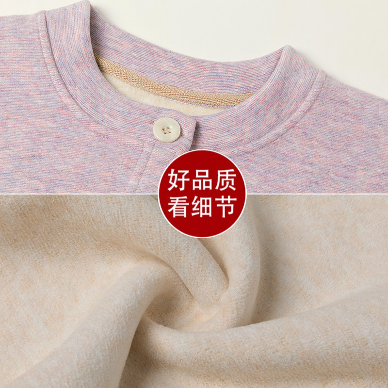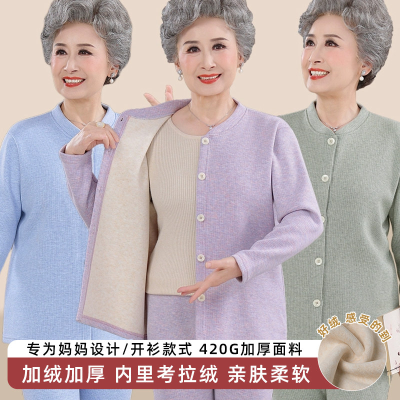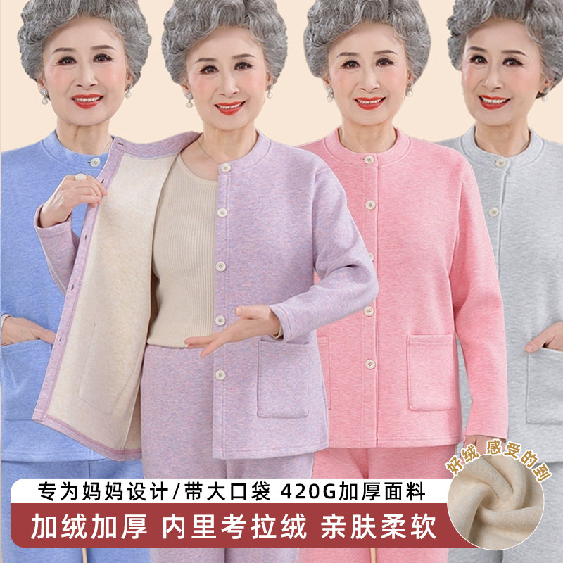 妈妈冬季保暖内衣女士加绒加厚羊毛蚕丝开衫中老年人奶奶外穿套装