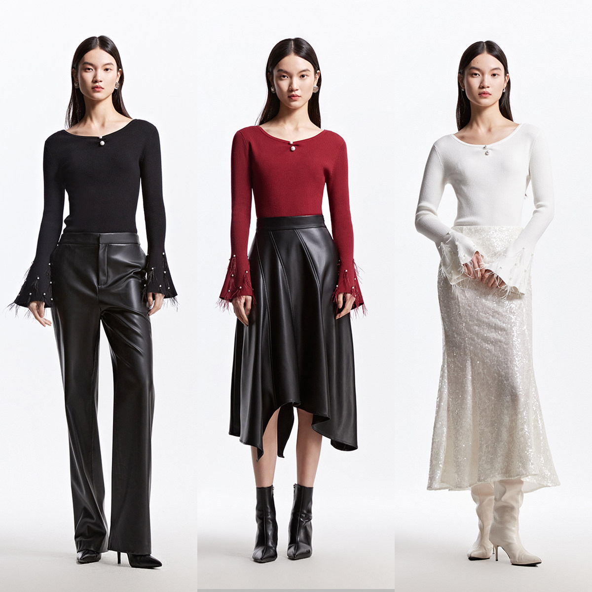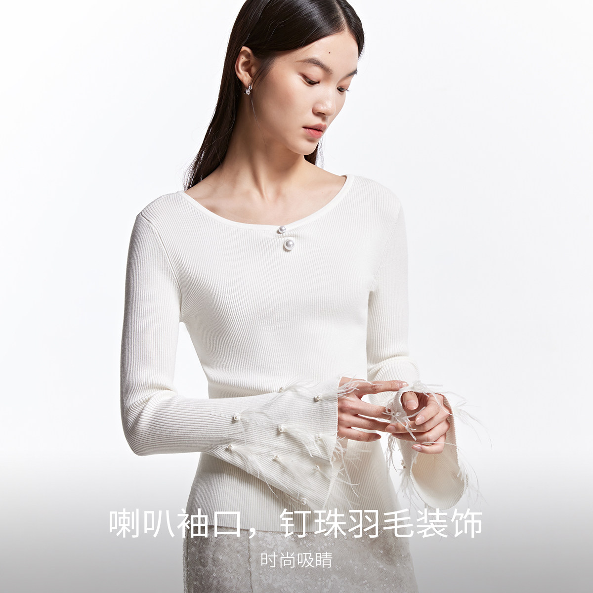 Vero Moda针织衫25春新款淑女风喇叭袖钉珠圆领收腰毛衣325124037
