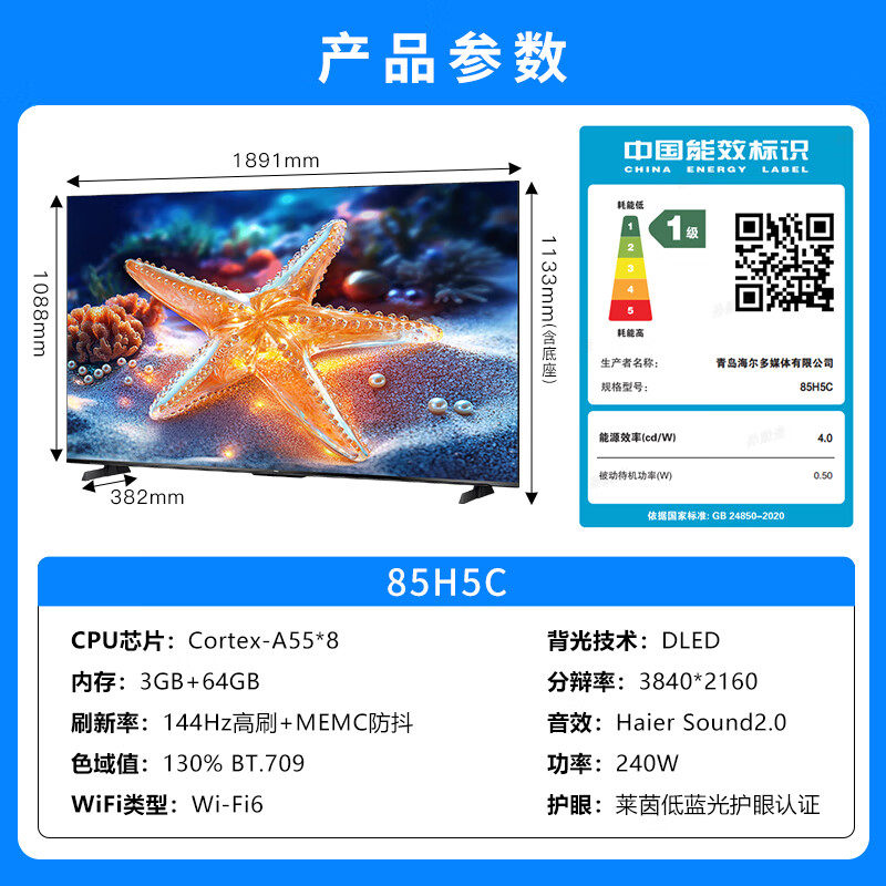 国家补贴海尔小红花65英寸144Hz高刷护眼4K平板液晶电视机H5C