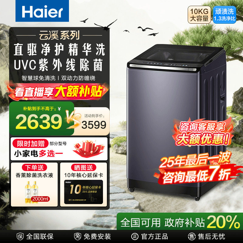 [减20%]海尔云溪免清洗直驱双动力10KG家用波轮精华洗衣机70E官方