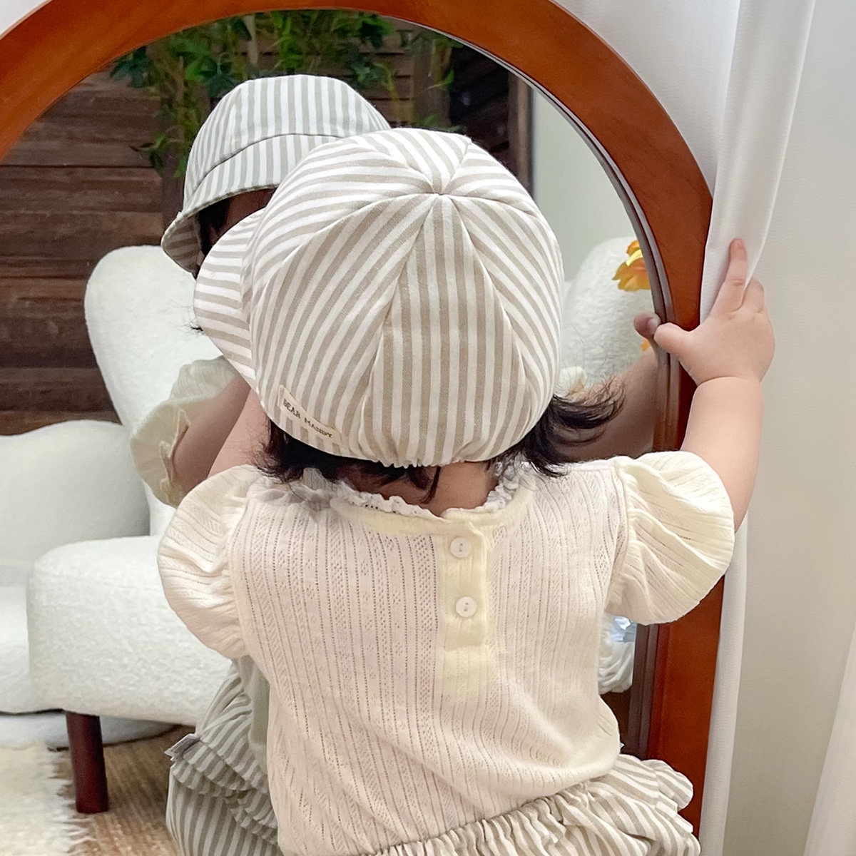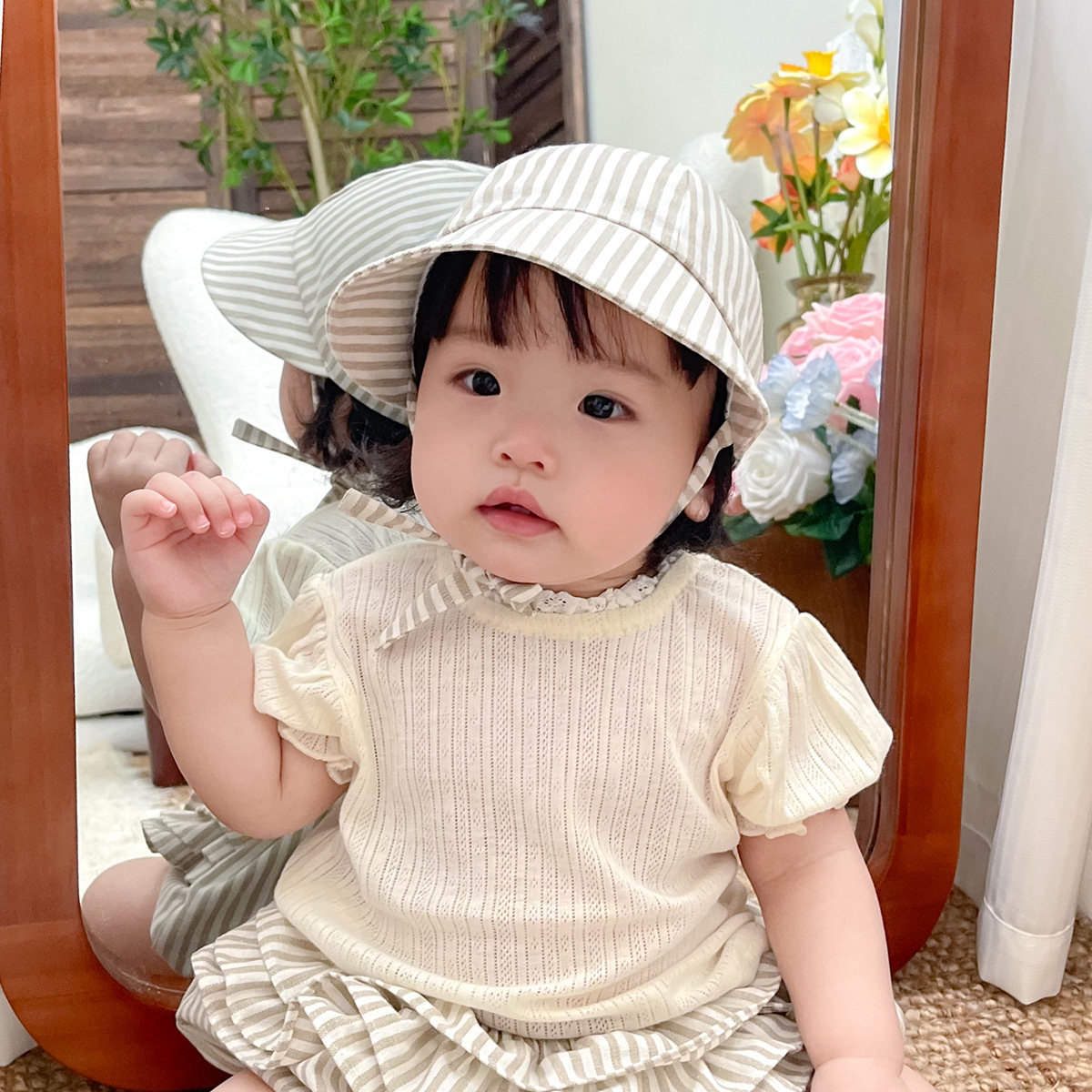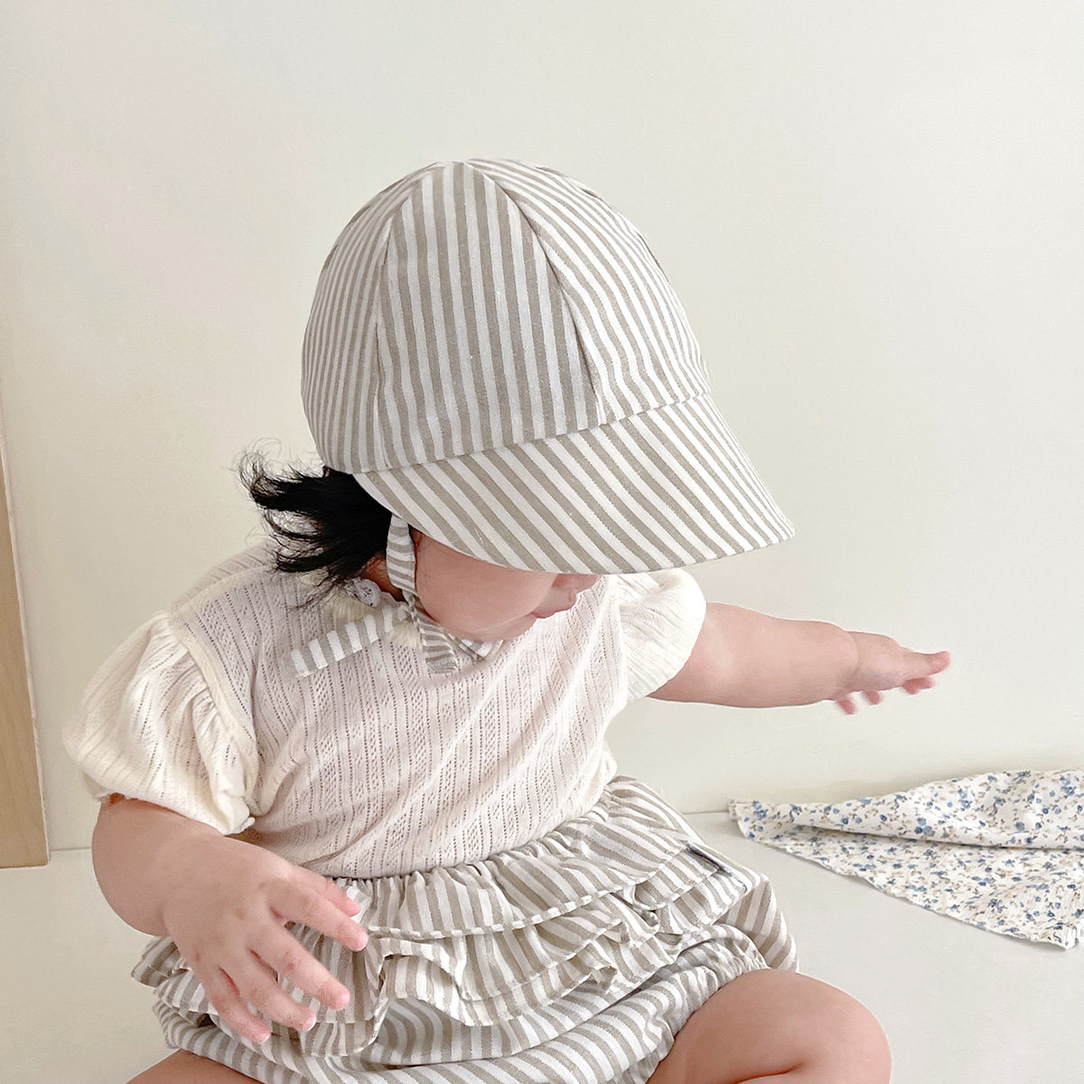婴儿遮阳帽条纹亚麻大帽檐防晒小月龄男女宝宝儿童棒球帽短裤夏季
