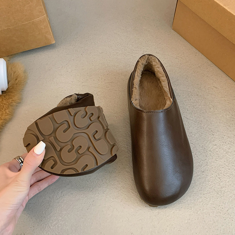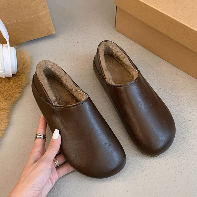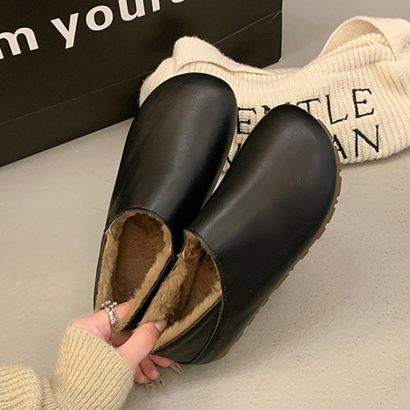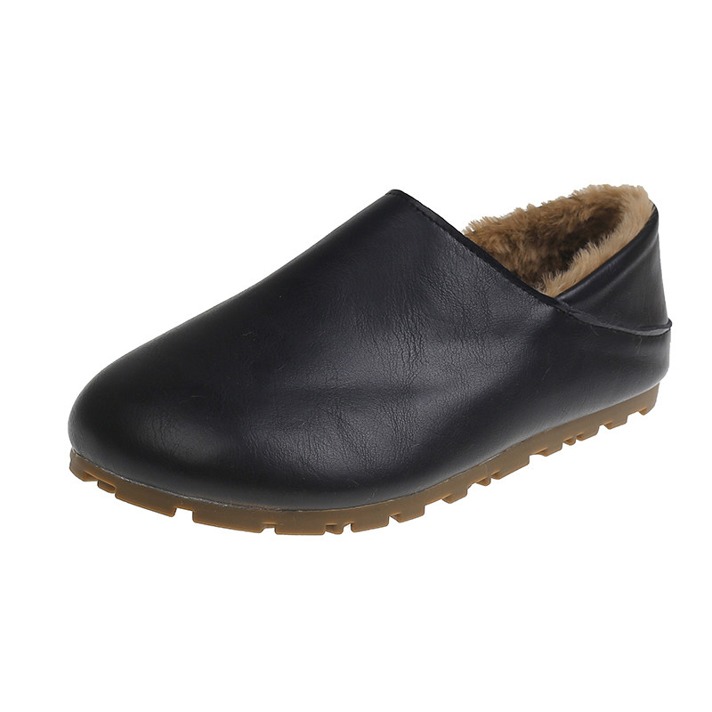 皮面防水加绒豆豆鞋女冬季2025新款一脚蹬保暖毛毛鞋软底孕妇棉鞋