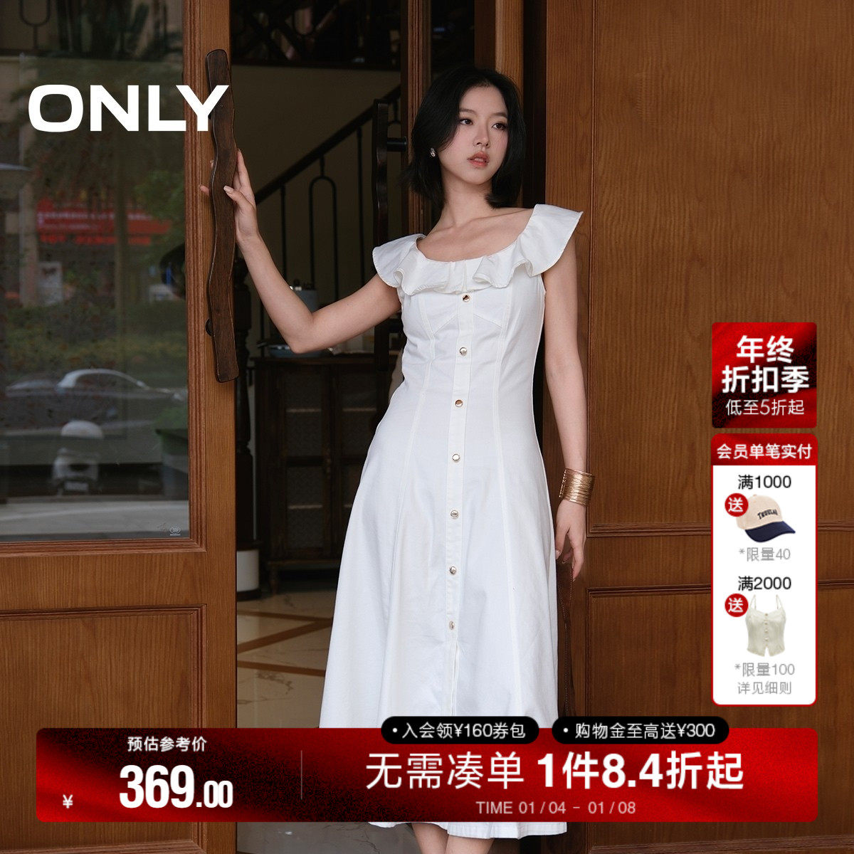 ONLY2025夏季新款减龄飞袖荷叶领拼接牛仔U型领白色中长裙连衣裙