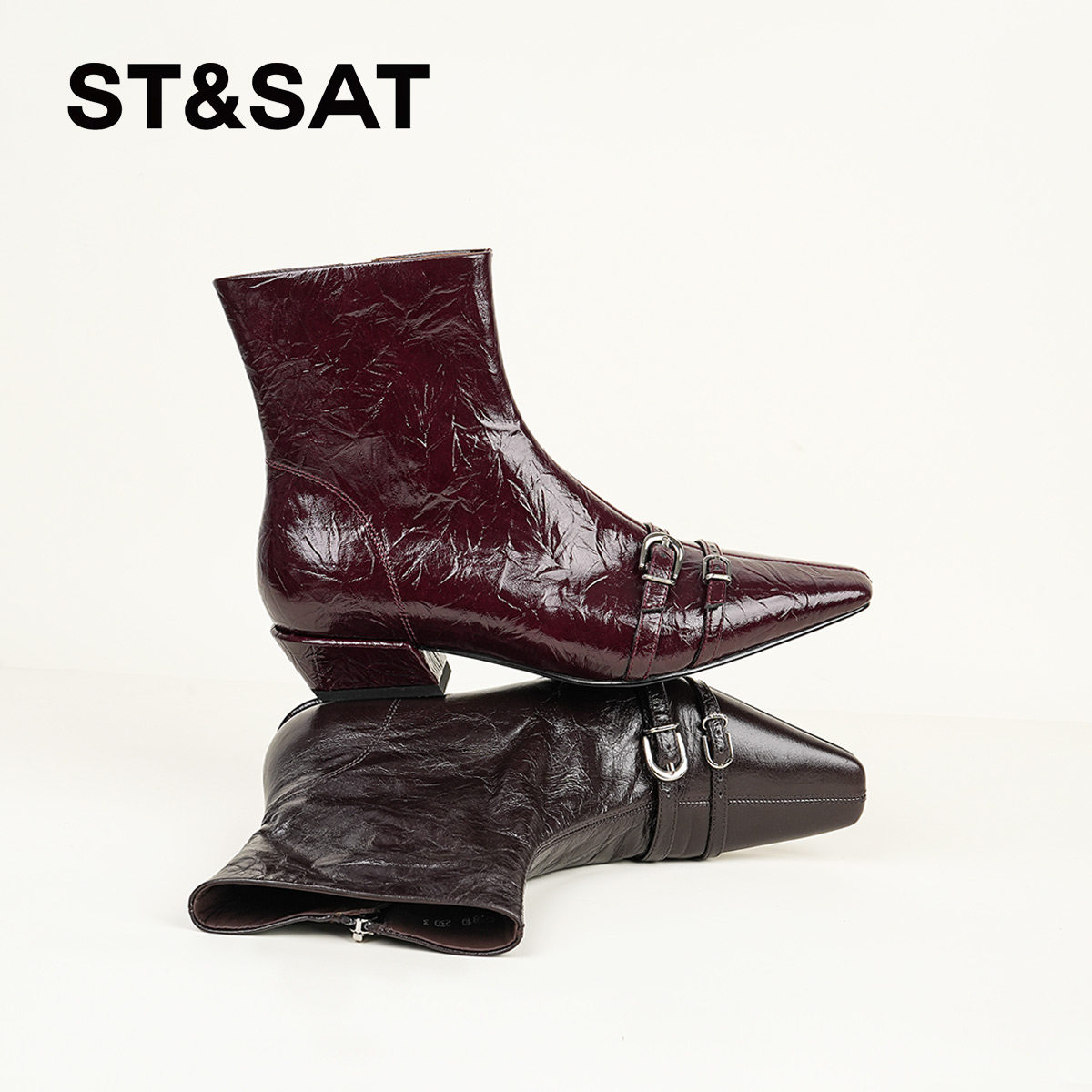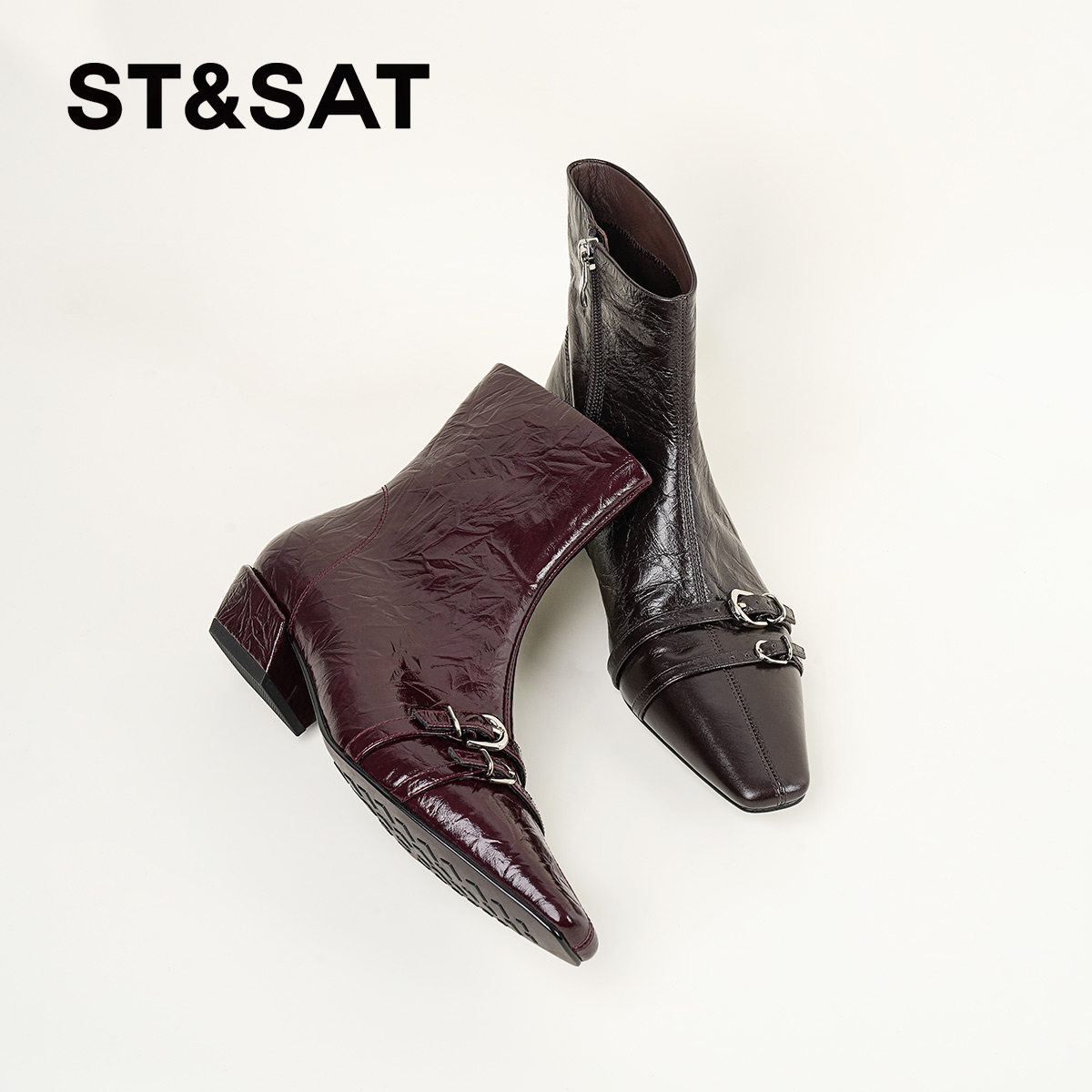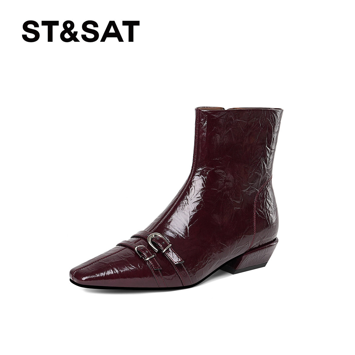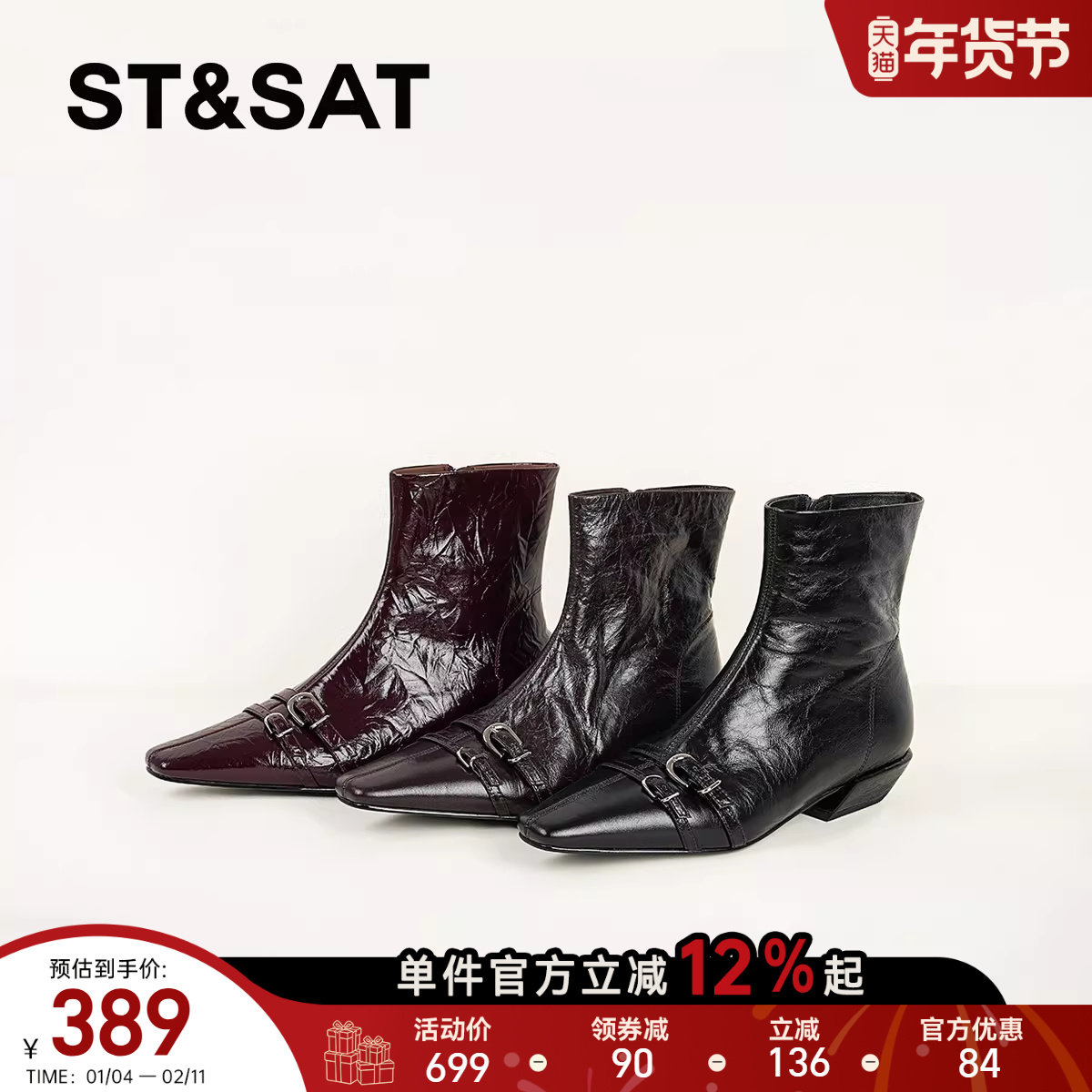 星期六黑色短靴女2025秋冬方头英伦风粗跟切尔西靴真皮侧拉链单靴