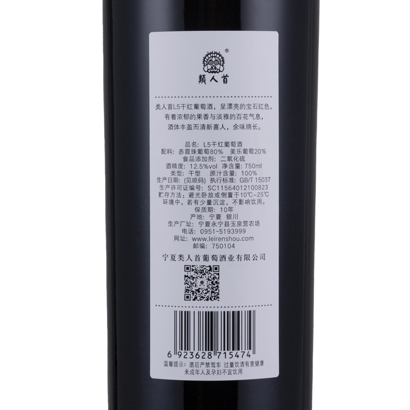 类人首 宁夏红酒L5赤霞珠混酿干红葡萄酒750ml*6支装酒庄直供